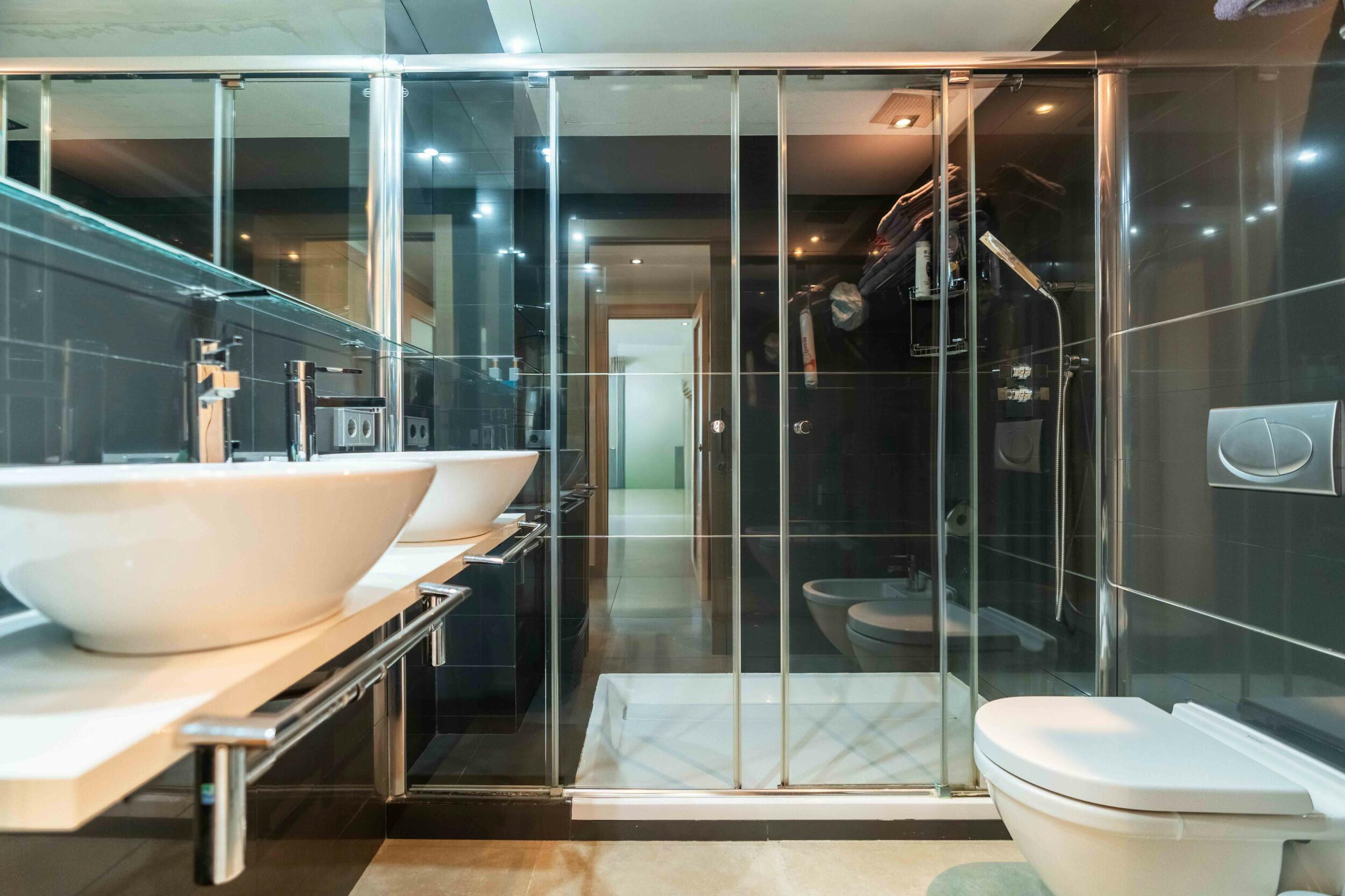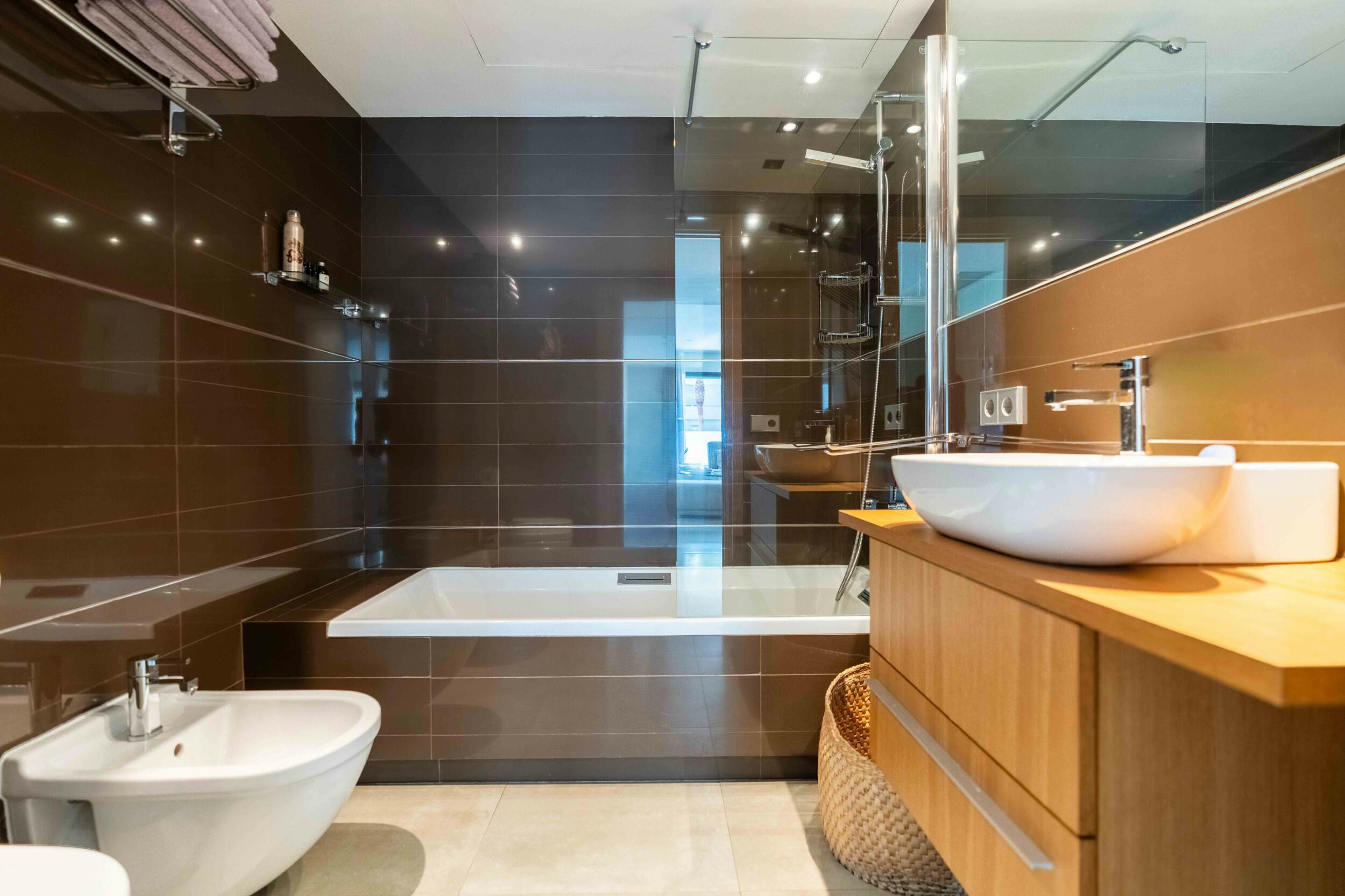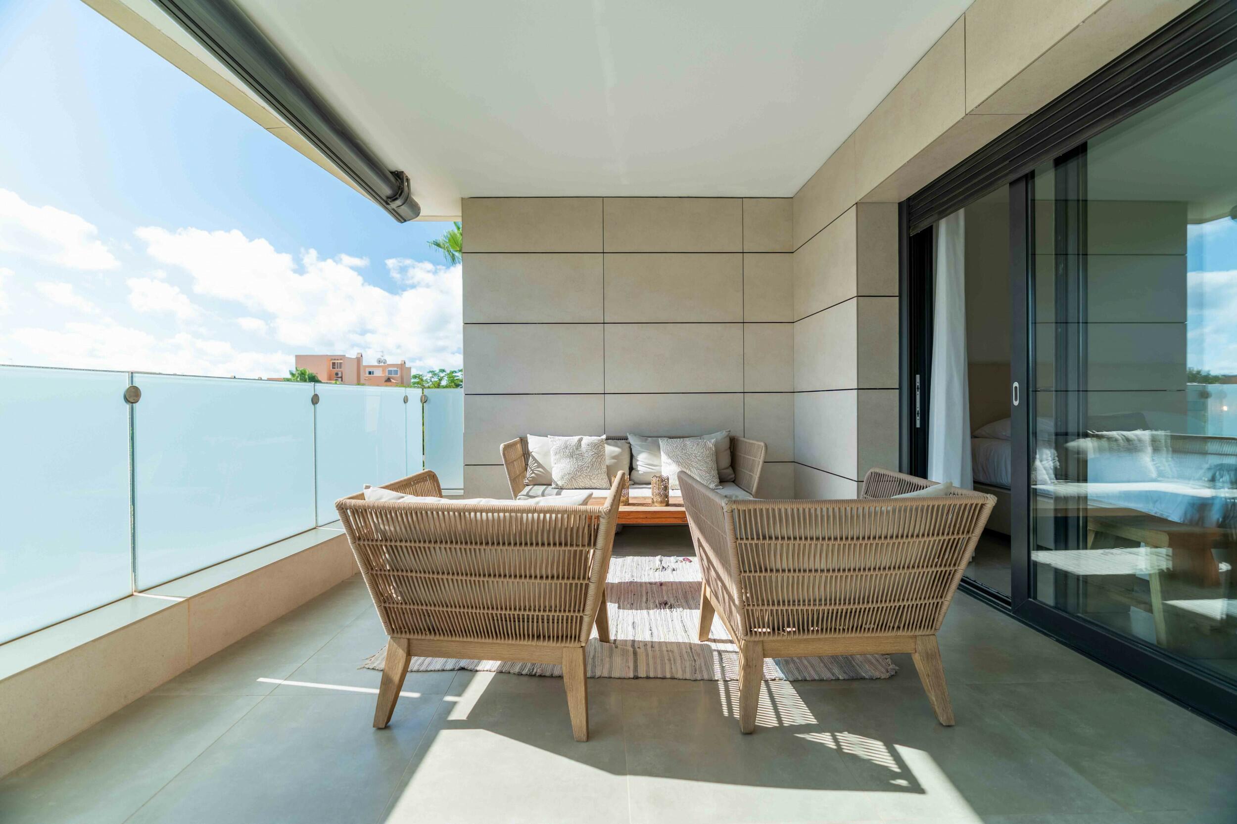 The apartment has a private terrace with an outdoor shower and storage room.
