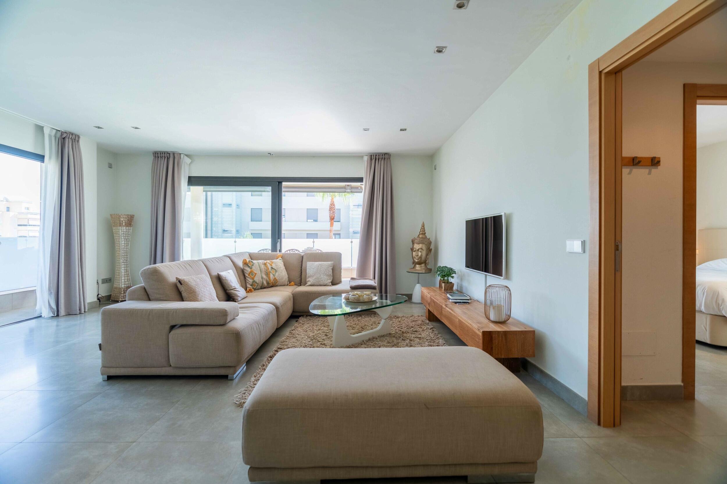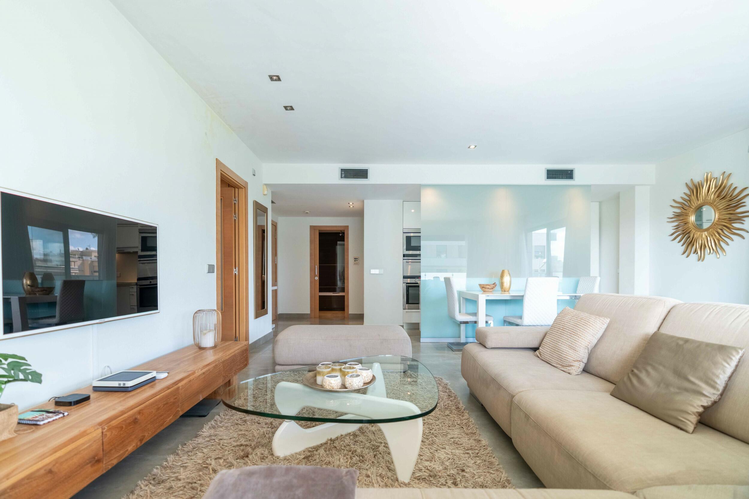 Upon entering the property, you enter directly into the bright living room with unique sea views to Formentera. Each room of this exceptional apartment fascinates with a unique atmosphere of well-being. The luxurious property has three bedrooms and two bathrooms and a fully equipped open kitchen.