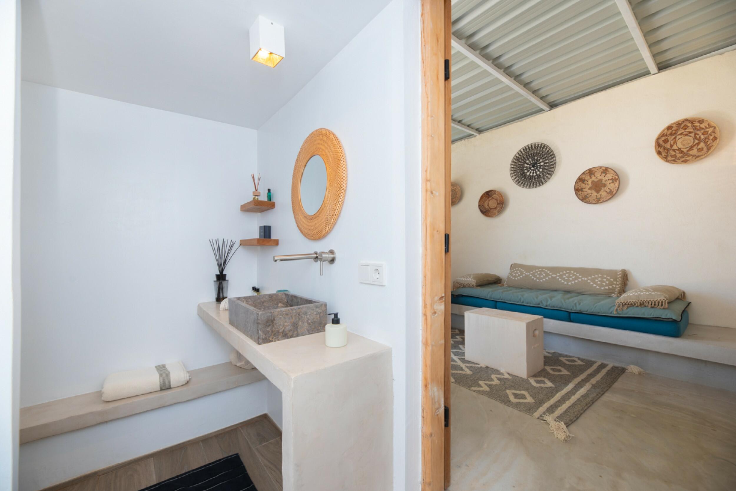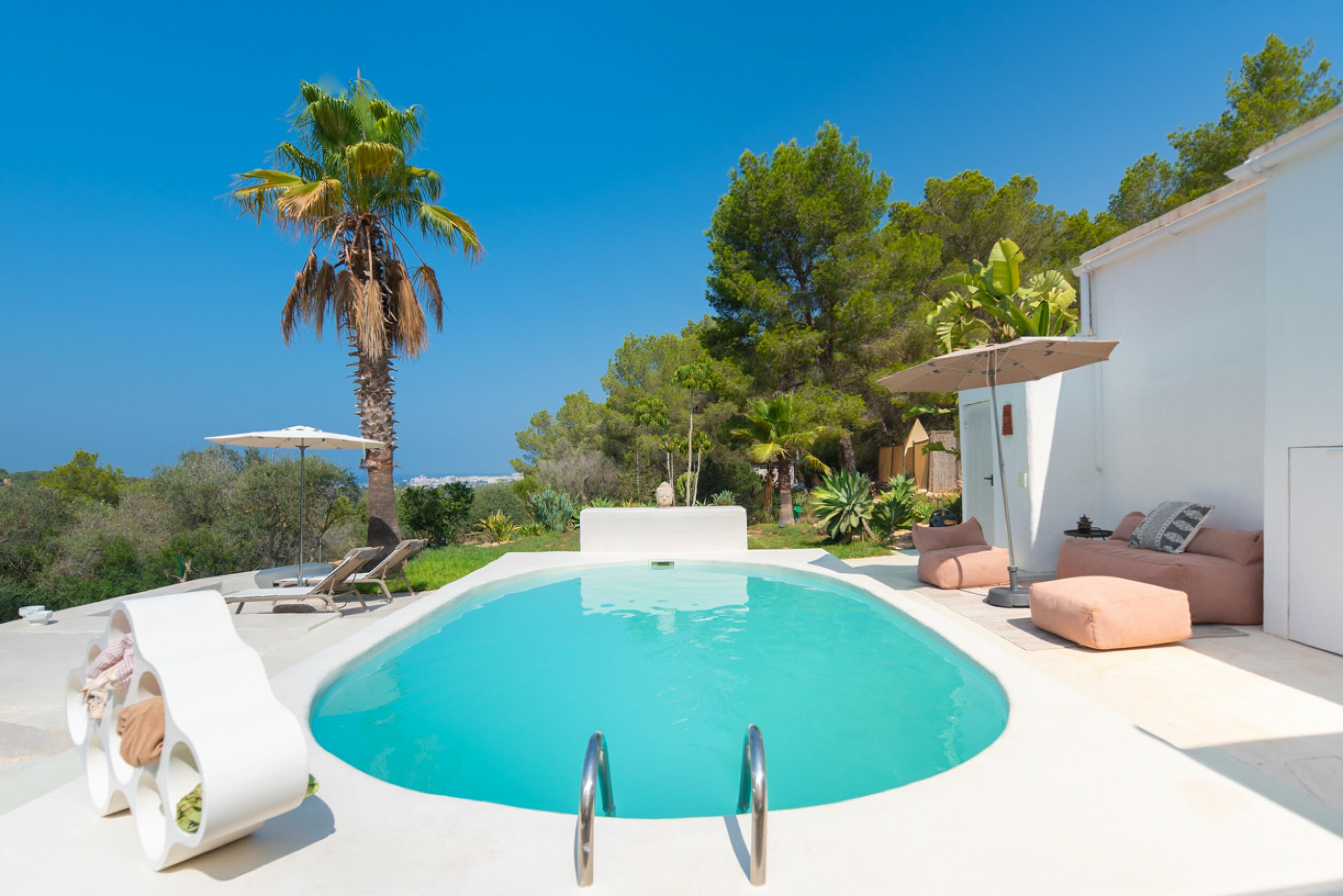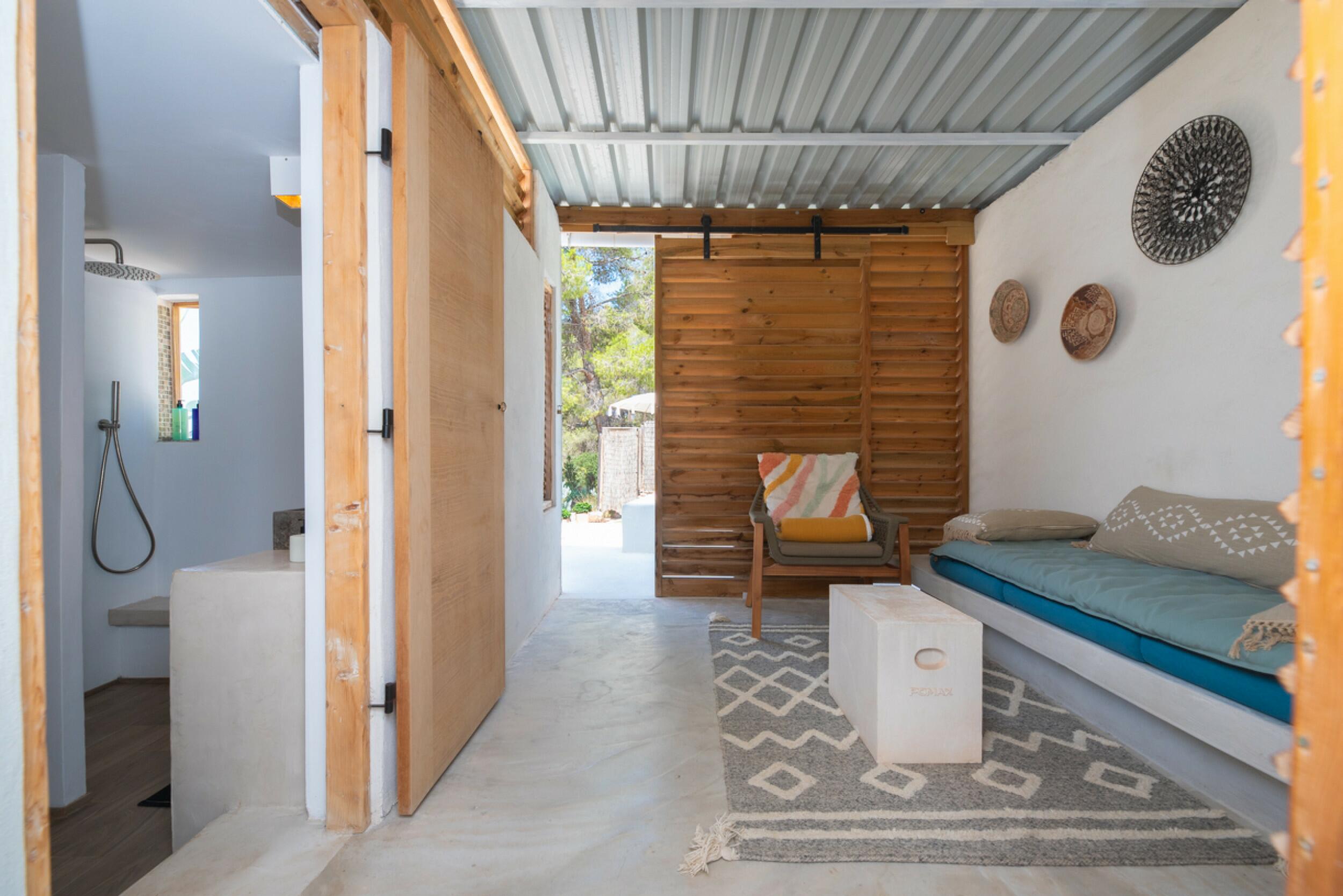 The exterior of the finca is meticulously designed to blend in with the natural surroundings, offering a garden with native vegetation, an orchard with a variety of fruits and greens, as well as a private swimming pool to enjoy Ibiza's sunny climate.