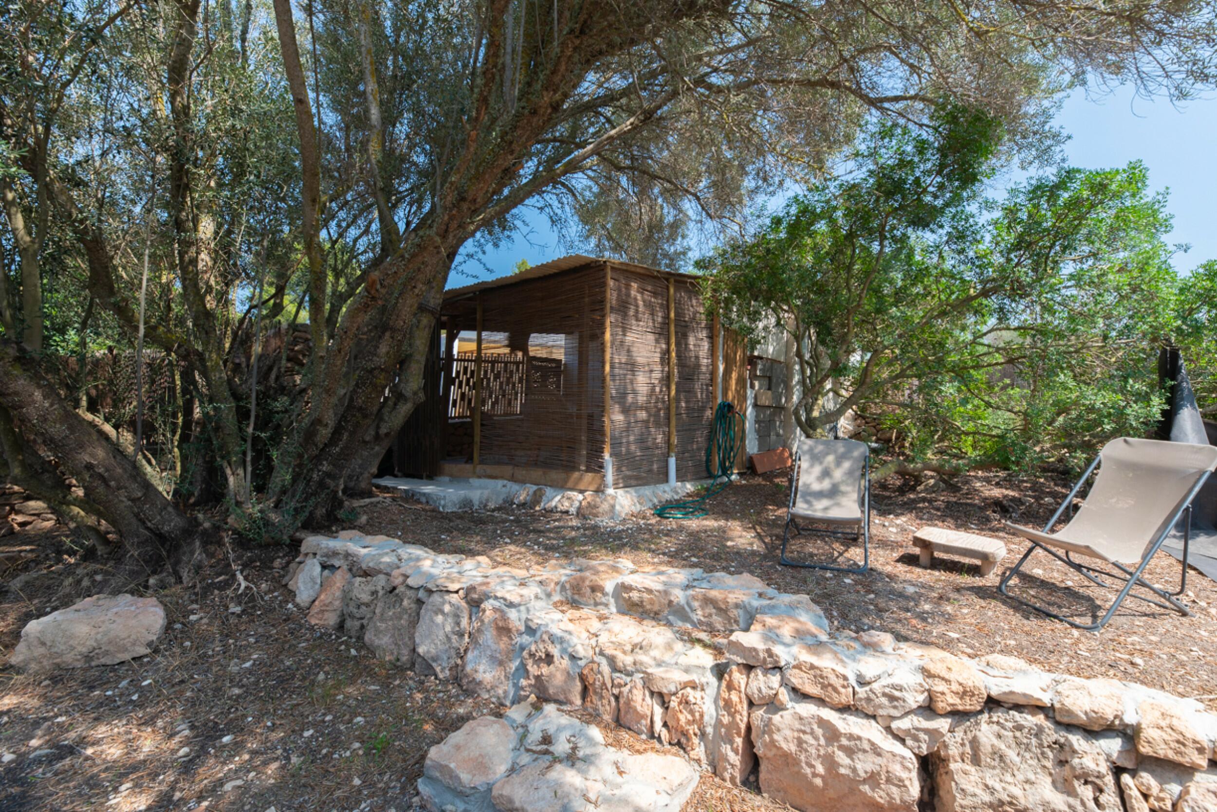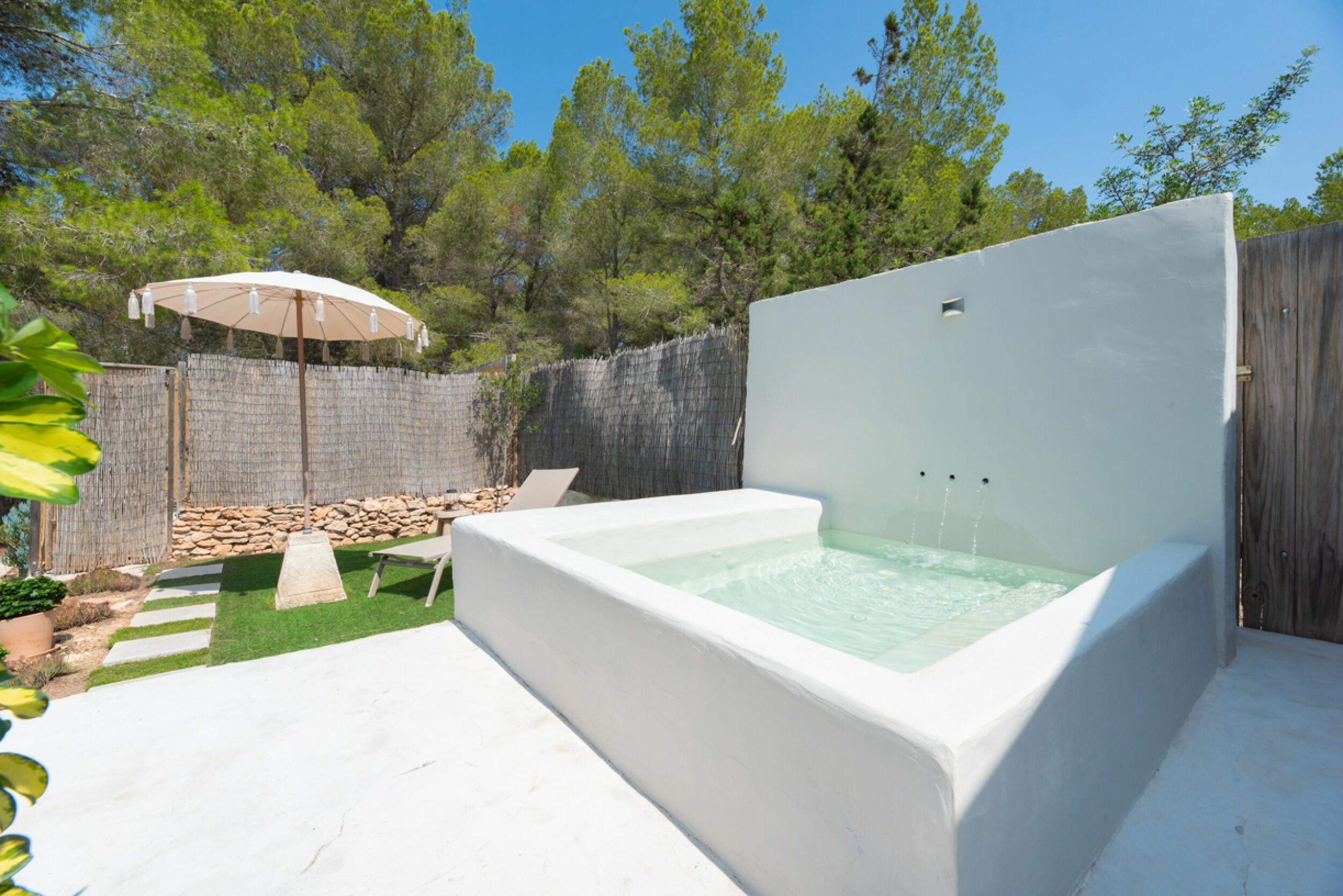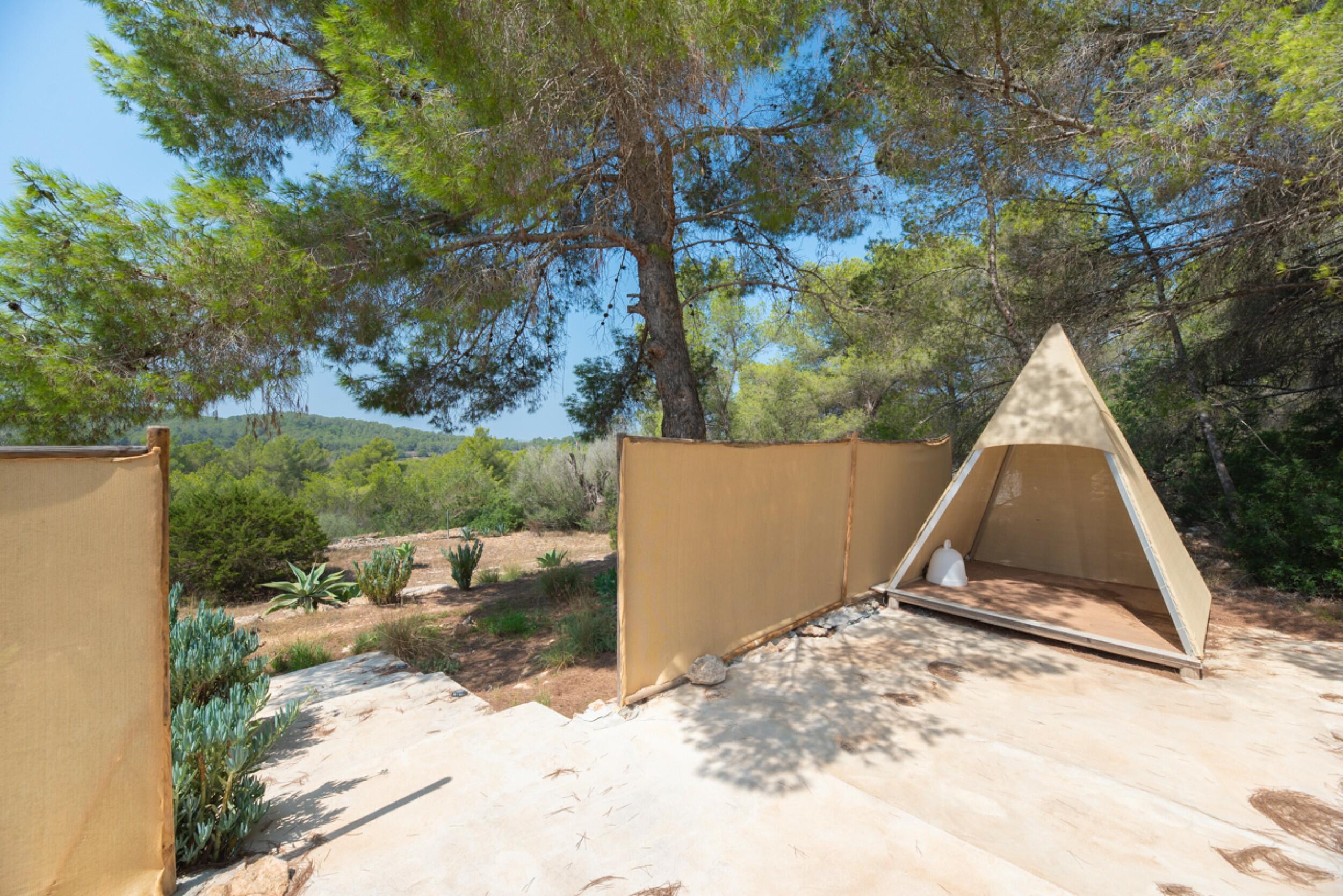 The exterior of the finca is meticulously designed to blend in with the natural surroundings, offering a garden with native vegetation, an orchard with a variety of fruits and greens, as well as a private swimming pool to enjoy Ibiza's sunny climate.