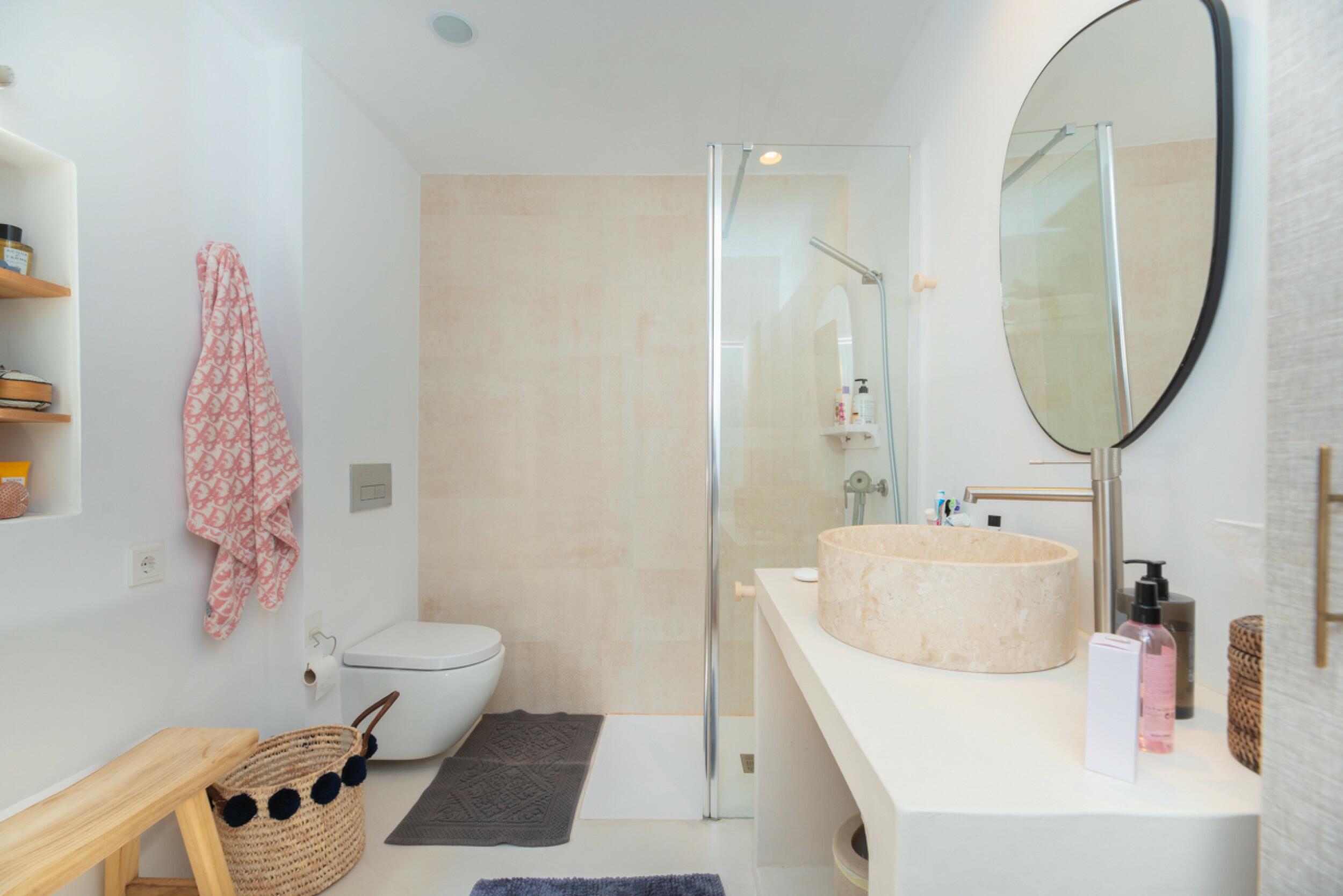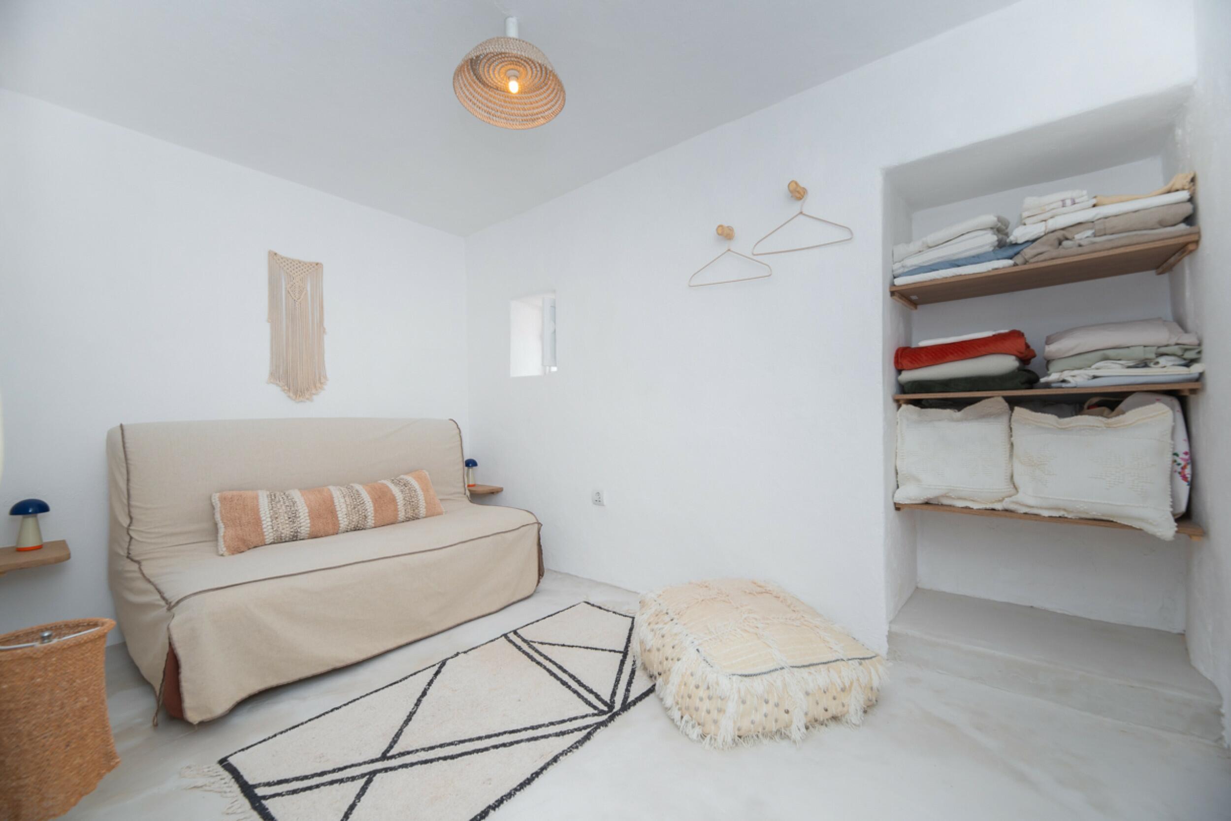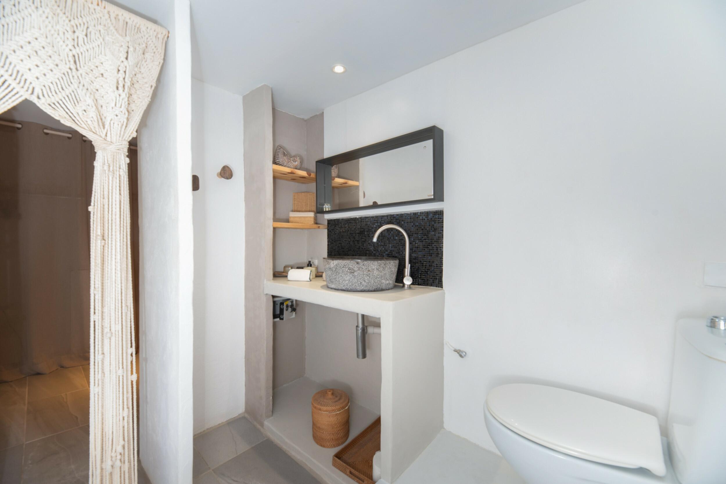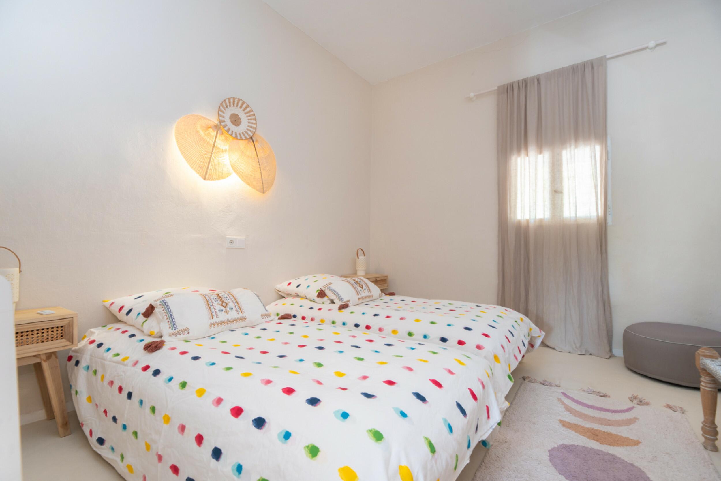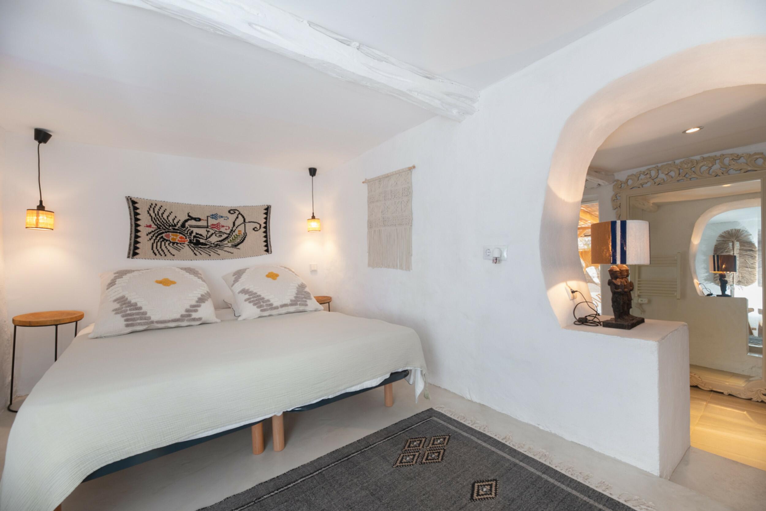 The charming Ibizan-style finca has two distinct structures: the main house and the guest house, which blend perfectly with the natural surroundings. With a total of 4 bedrooms and 4 bathrooms between them, plus a cozy kitchen and a bright living room, it offers a comfortable and charming space to enjoy life in Ibiza.