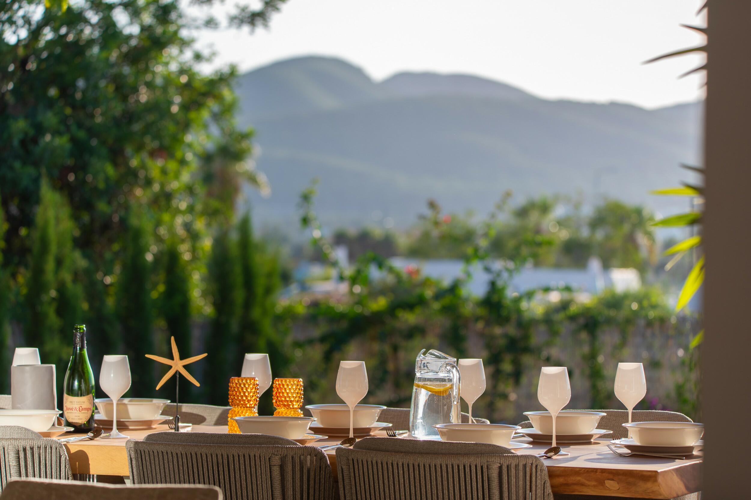 Surrounded by vibrant Mediterranean landscaping, the exterior spaces are designed for leisure and outdoor living. The gardens are adorned with mature vegetation, a Buddha fountain, and peaceful corners to unwind. A swimming pool with colour-changing lights creates a magical ambience in the evening, complemented by a Balinese-style chill-out area, an outdoor kitchen, and a shaded dining space under the porch. There is also the potential to create a rooftop terrace, and the property includes a private vegetable garden.