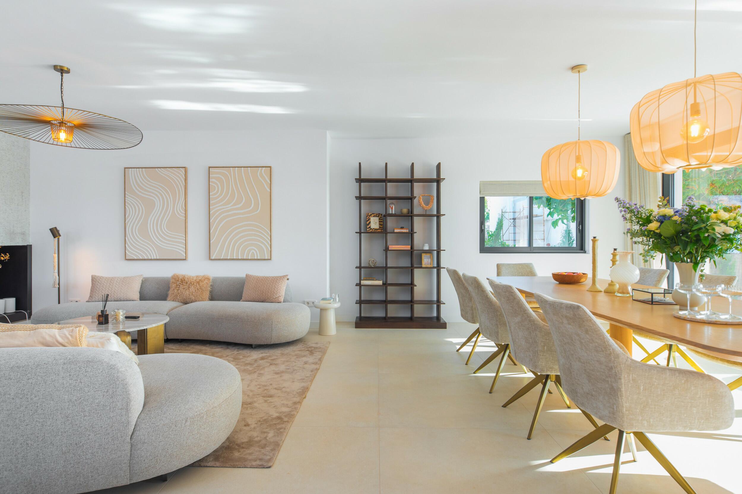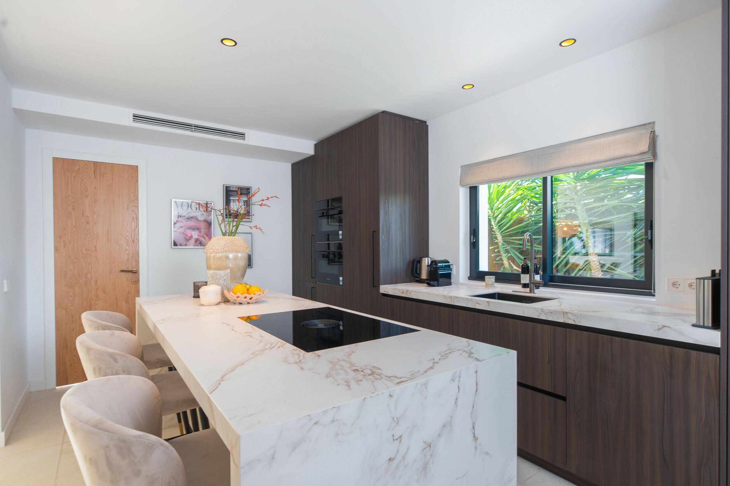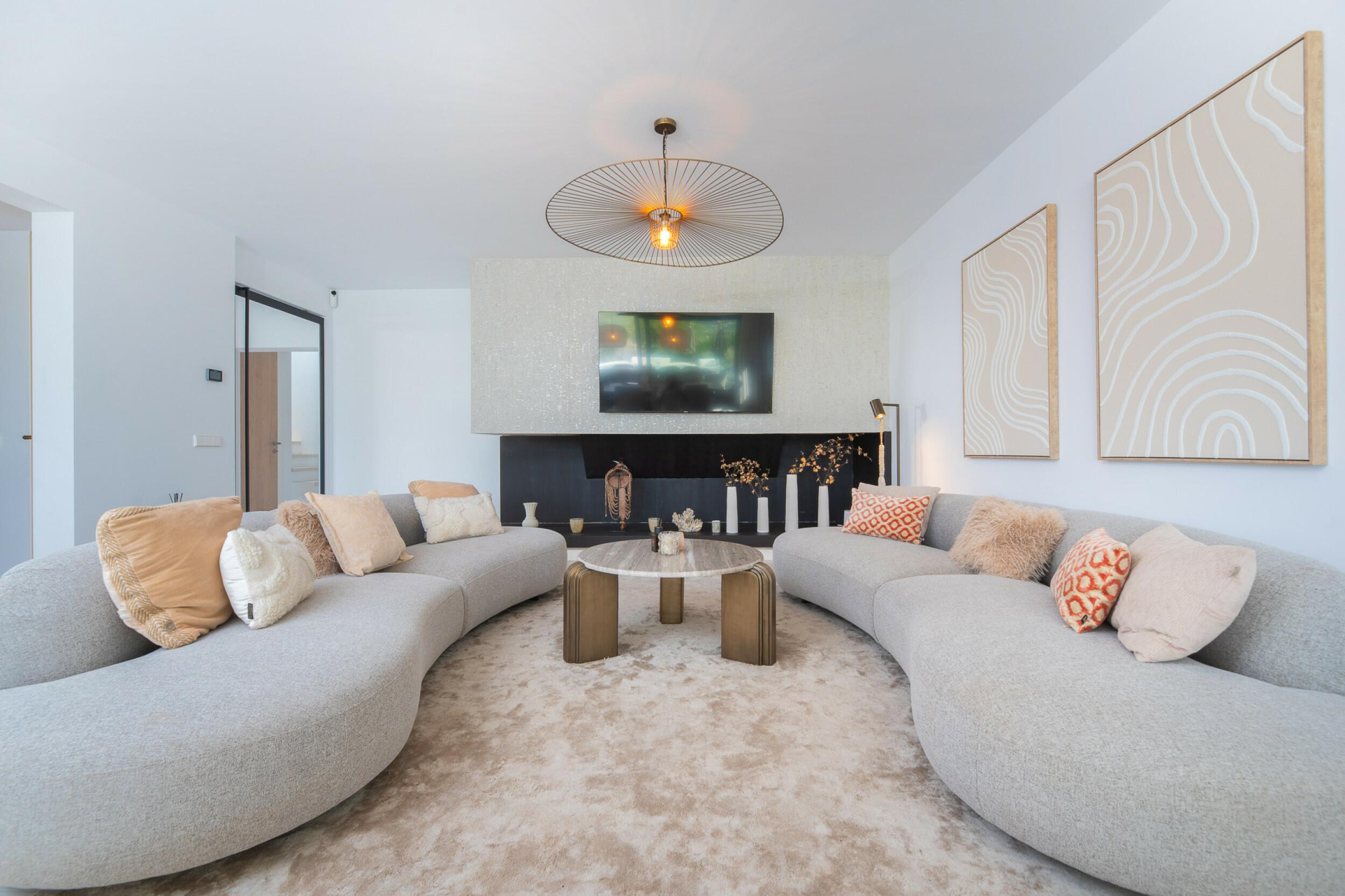 The villa is thoughtfully divided into two independent levels, offering flexibility and comfort. The main level boasts a grand entrance hall, a bright and airy living and dining area with panoramic windows, and a modern open-plan kitchen with a central island and top-of-the-range appliances. The lower level presents an additional kitchen, a dining area with a distinctive oval table featuring a yin-yang design, and multiple lounge areas designed for relaxation. The property offers seven bedrooms and six bathrooms in total, including several en-suite rooms that provide privacy and convenience.