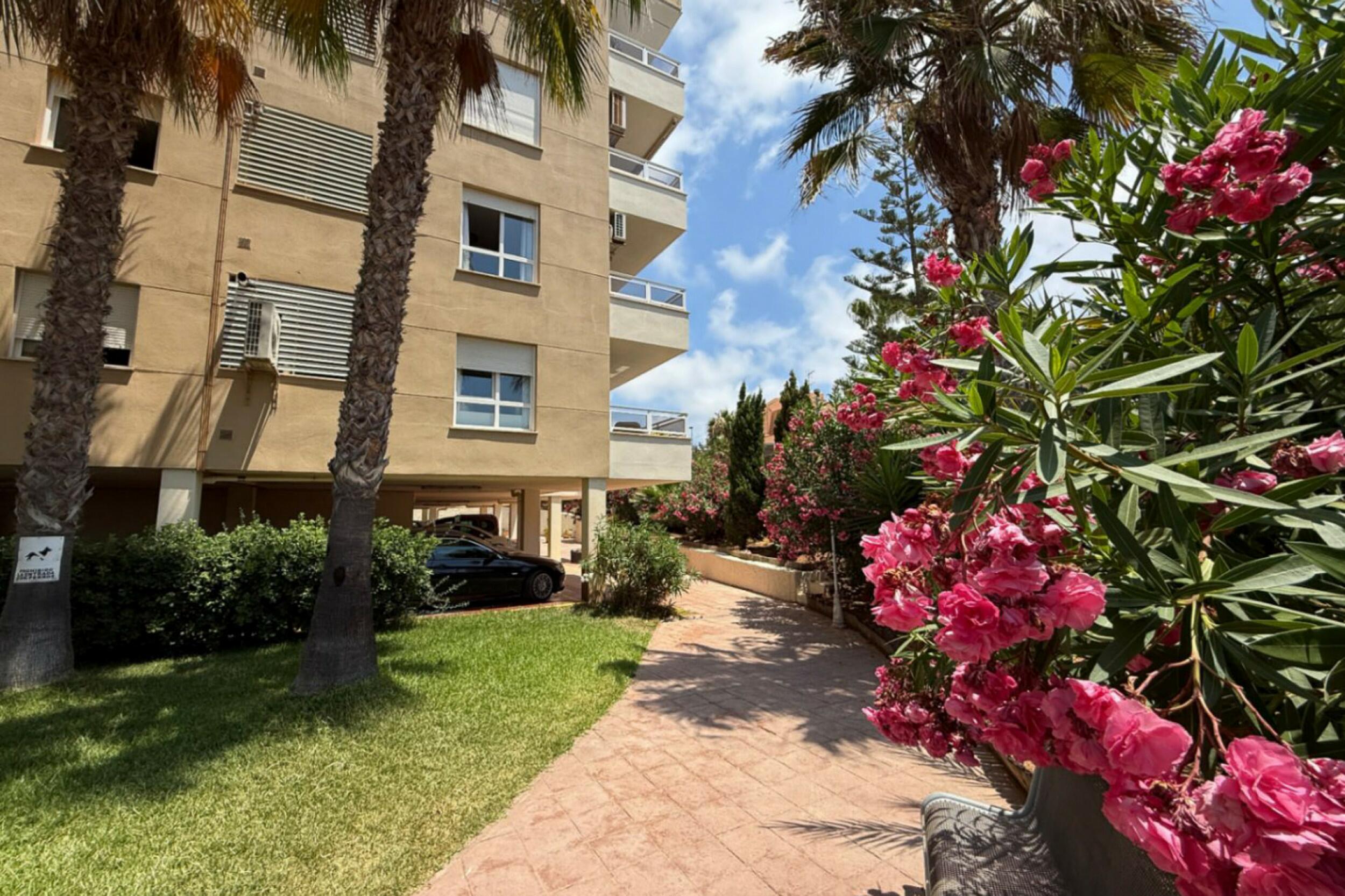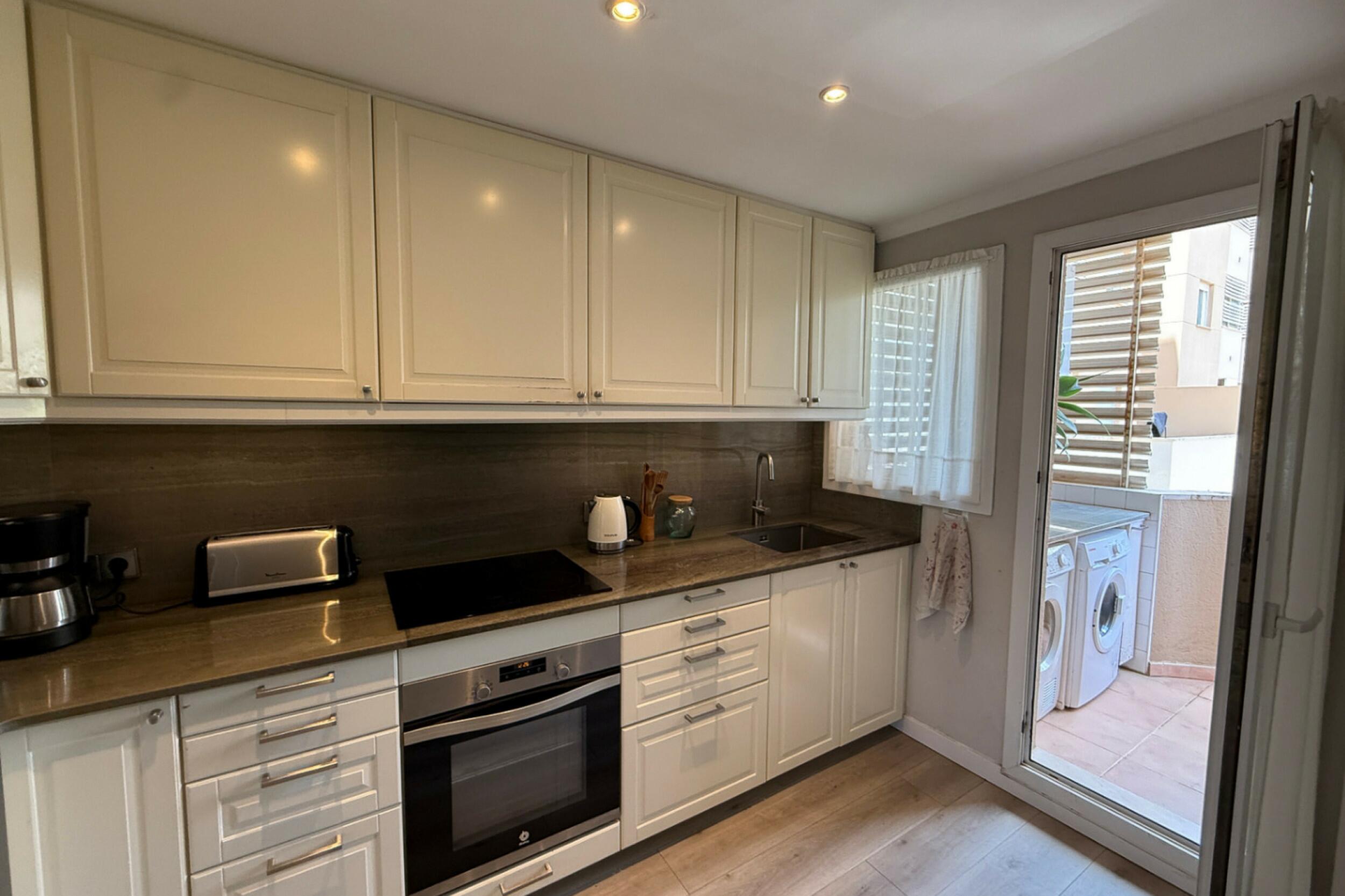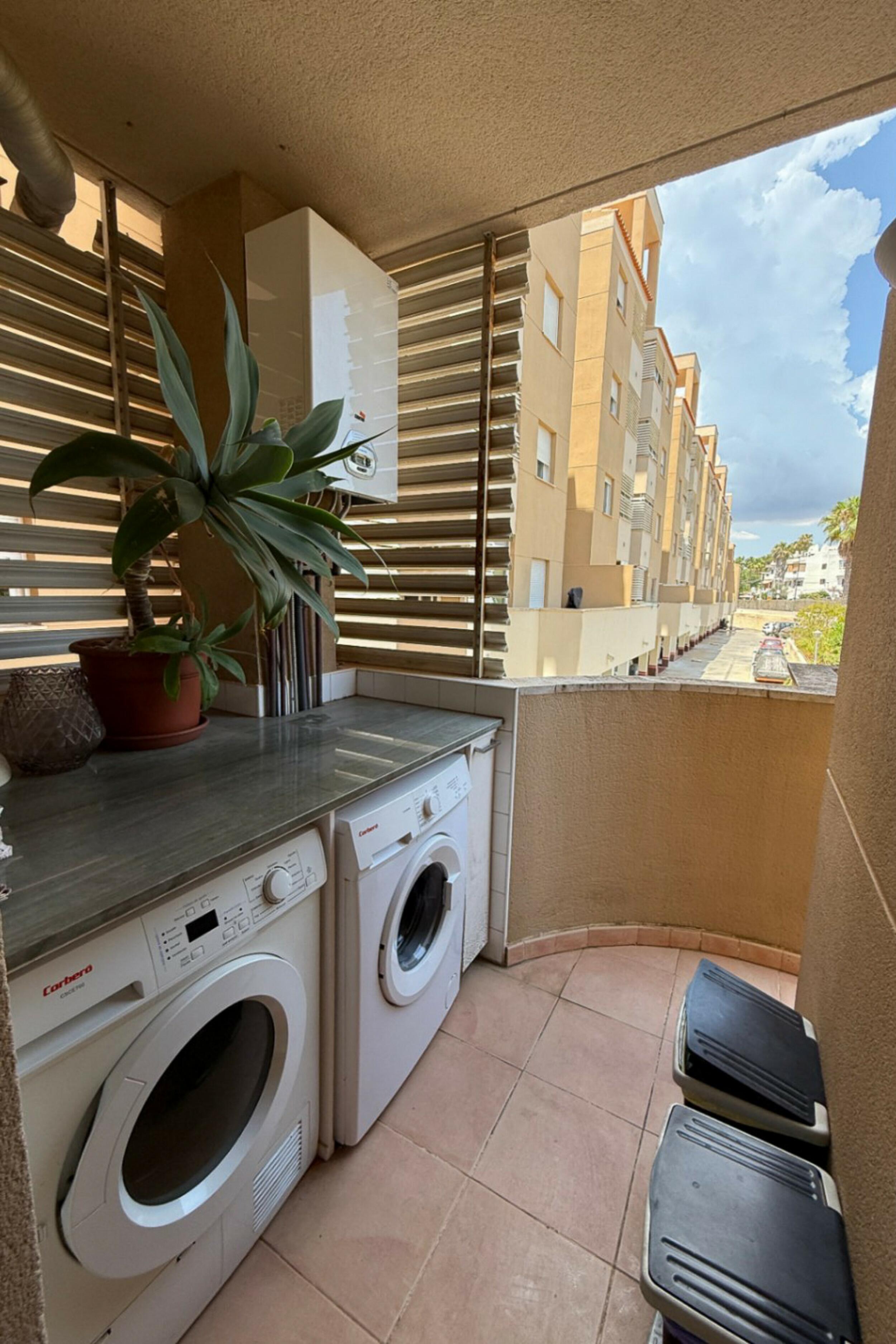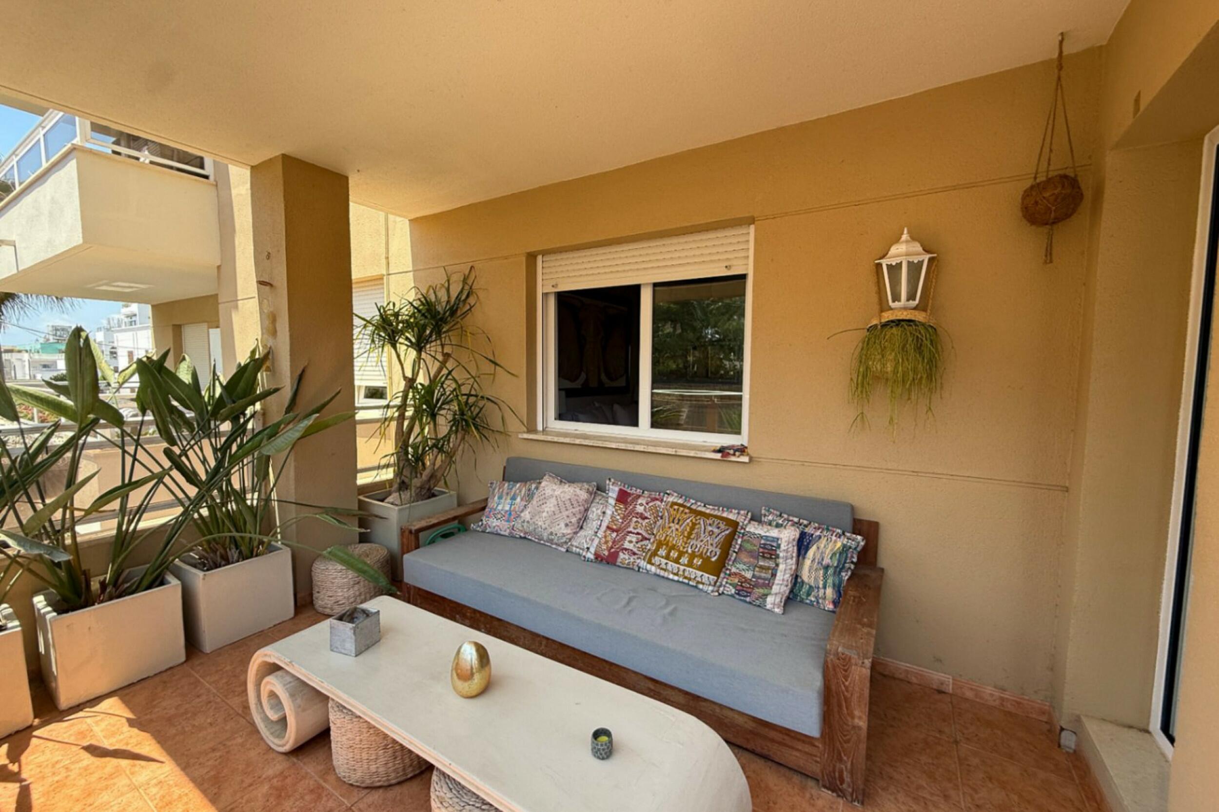 A private terrace extends the living area outdoors, offering a pleasant setting to relax and enjoy the fresh sea breeze. Residents of the Bossa Mar complex benefit from a generous communal swimming pool set within a gated environment, along with direct access to the beach promenade.