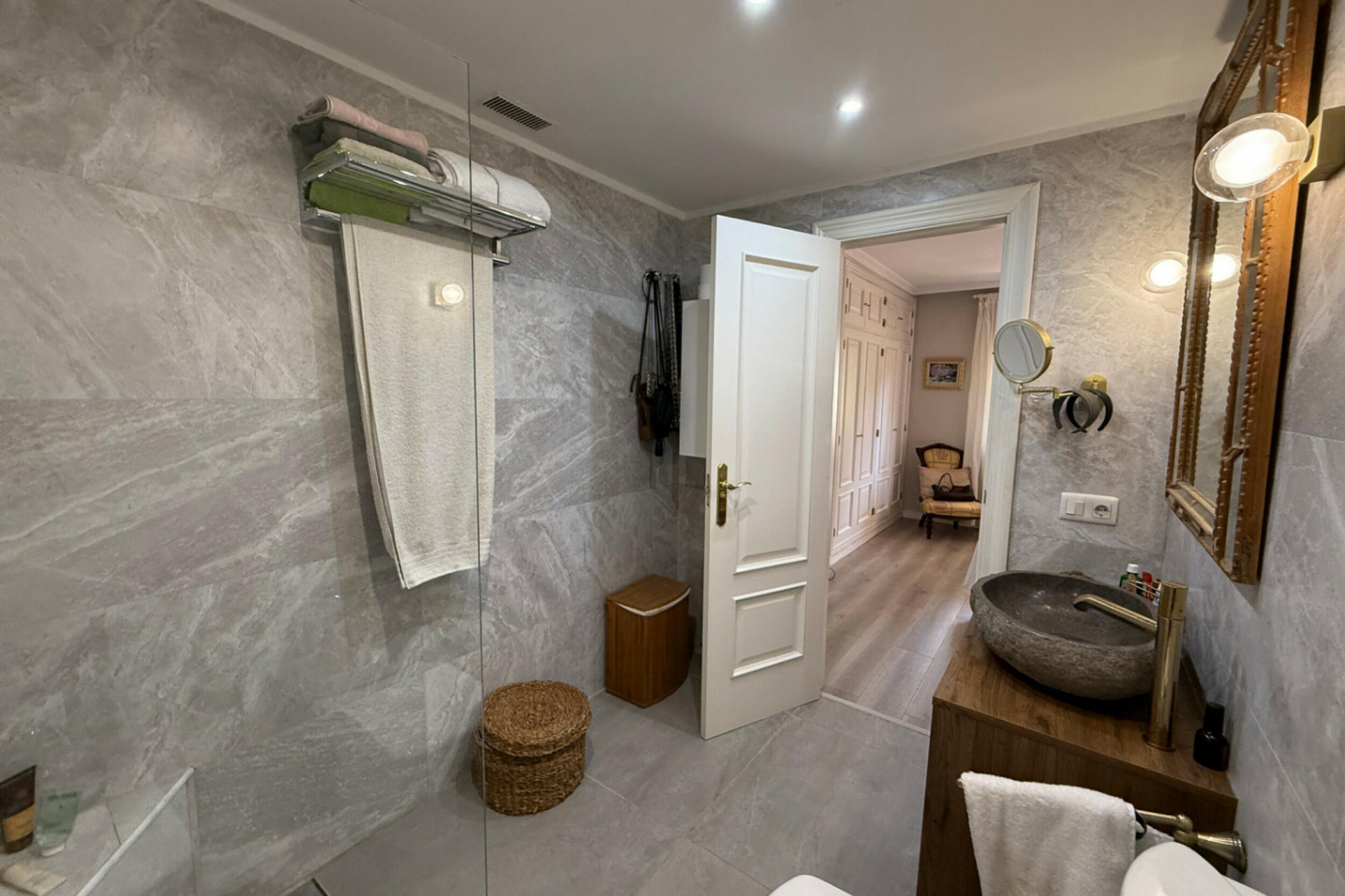 Upon entry, a bright hallway leads to a first double bedroom with its own bathroom, followed by a spacious principal suite complete with bathtub and en suite facilities. The open-plan living and dining area connects seamlessly to the terrace, while the adjacent kitchen is partially open, allowing natural light and flow throughout the space.