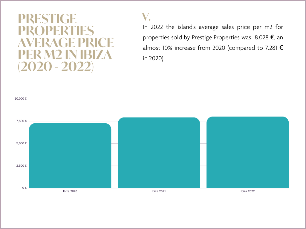 Our internal statistics from our sales database at Prestige Properties Ibiza calculated an average increase in price per square metre, from 7.281€ to 8.028€, approximately a 10% rise between 2020 and 2022.