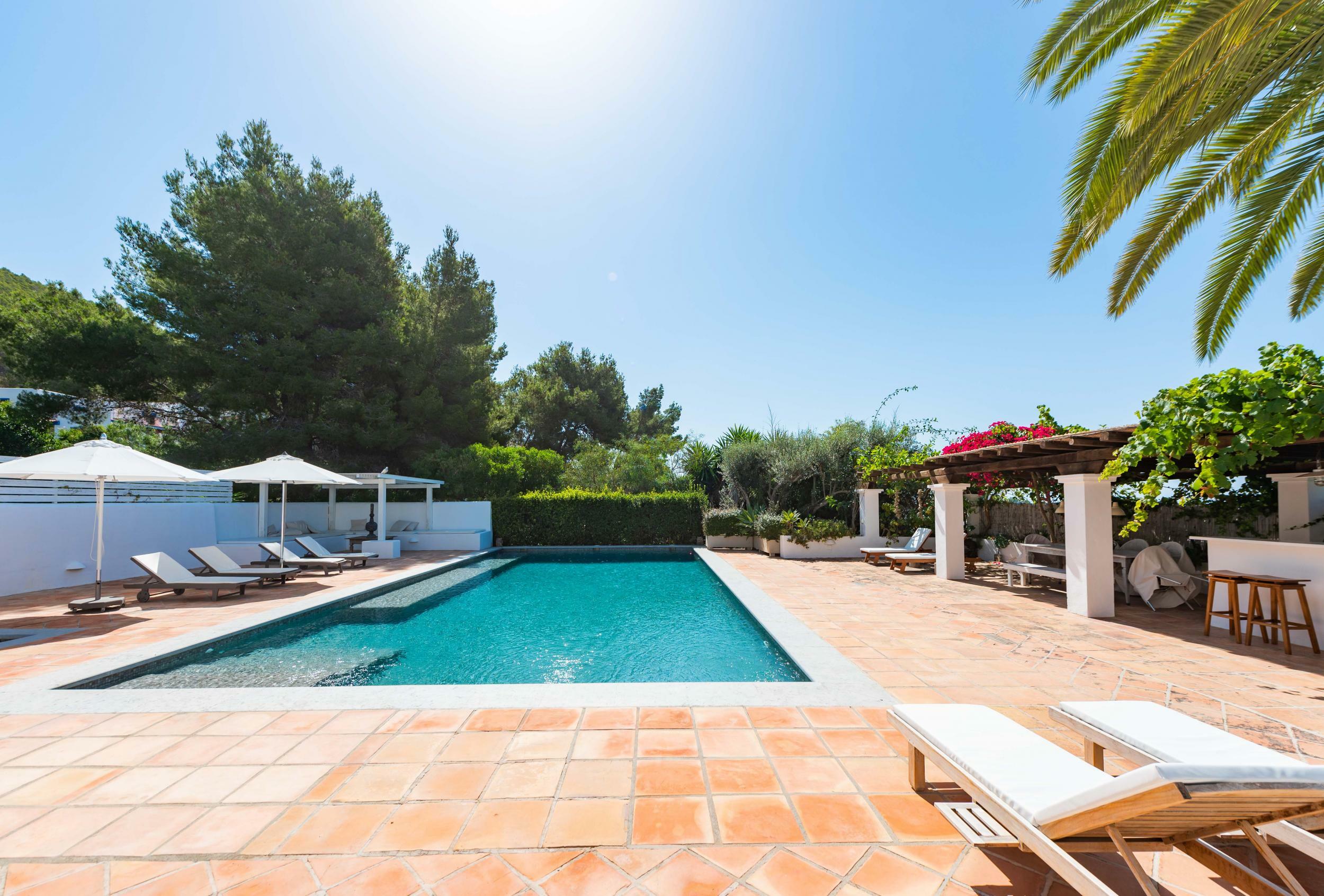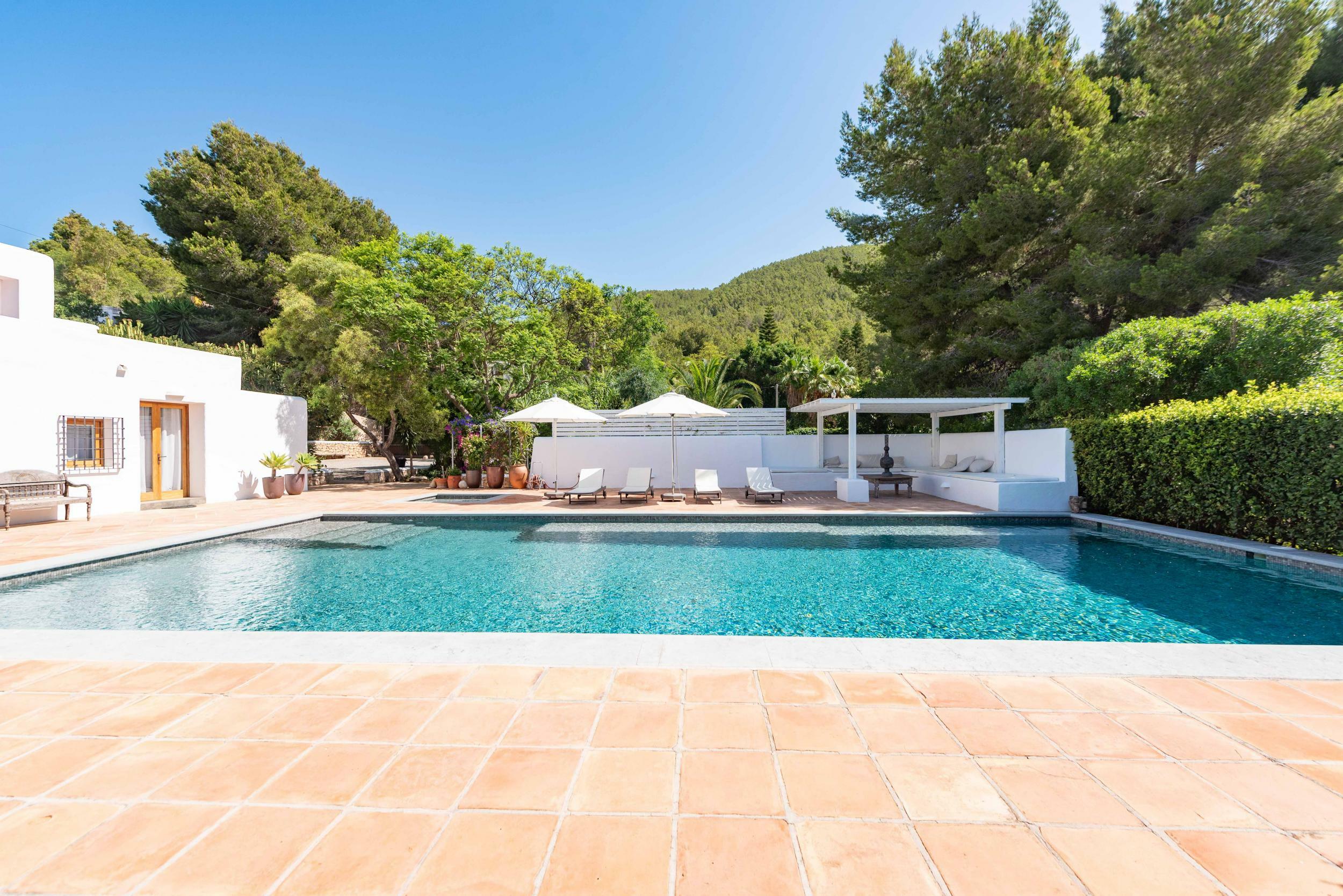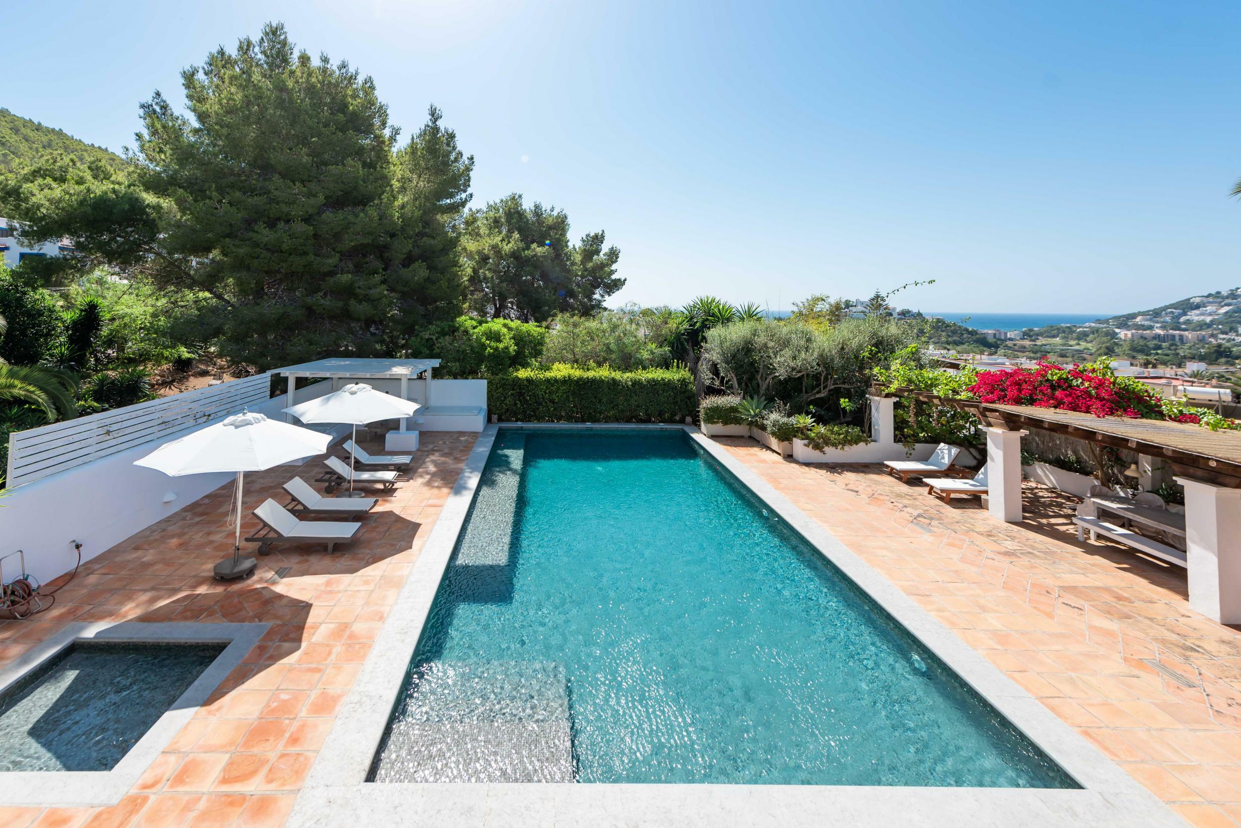 The villa’s terraces are designed for easy, all-day outdoor living. The rectangular pool, lined with turquoise tiles, is framed by sunbeds, umbrellas and lush planting for privacy.