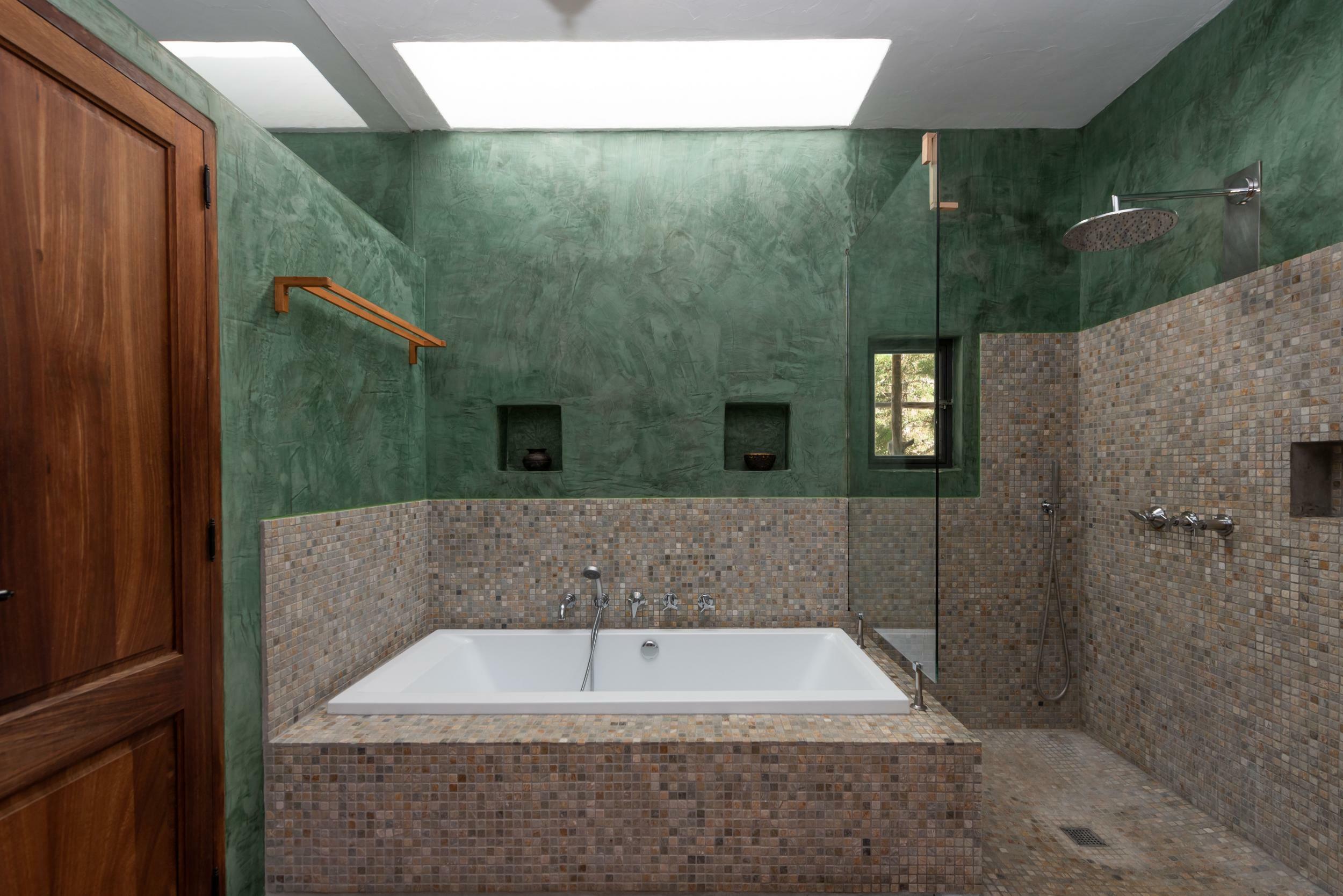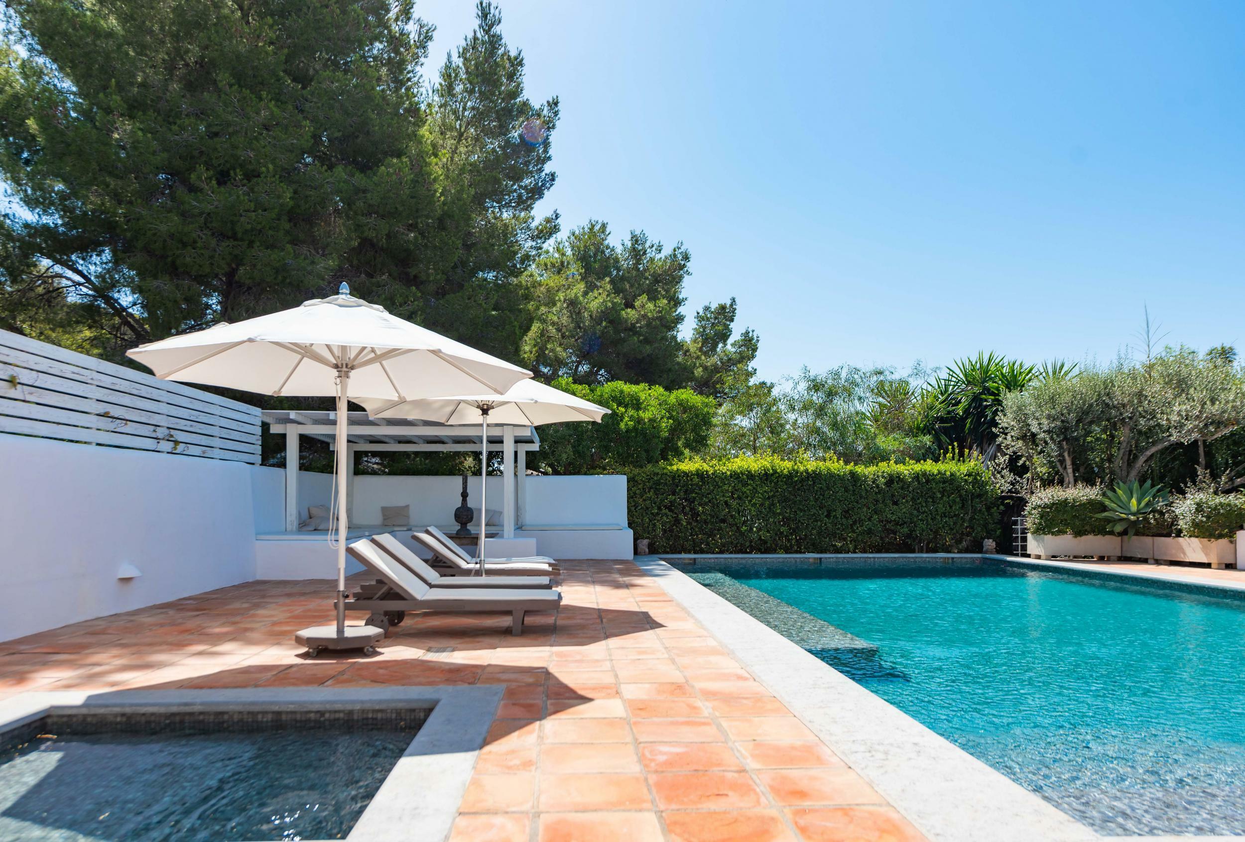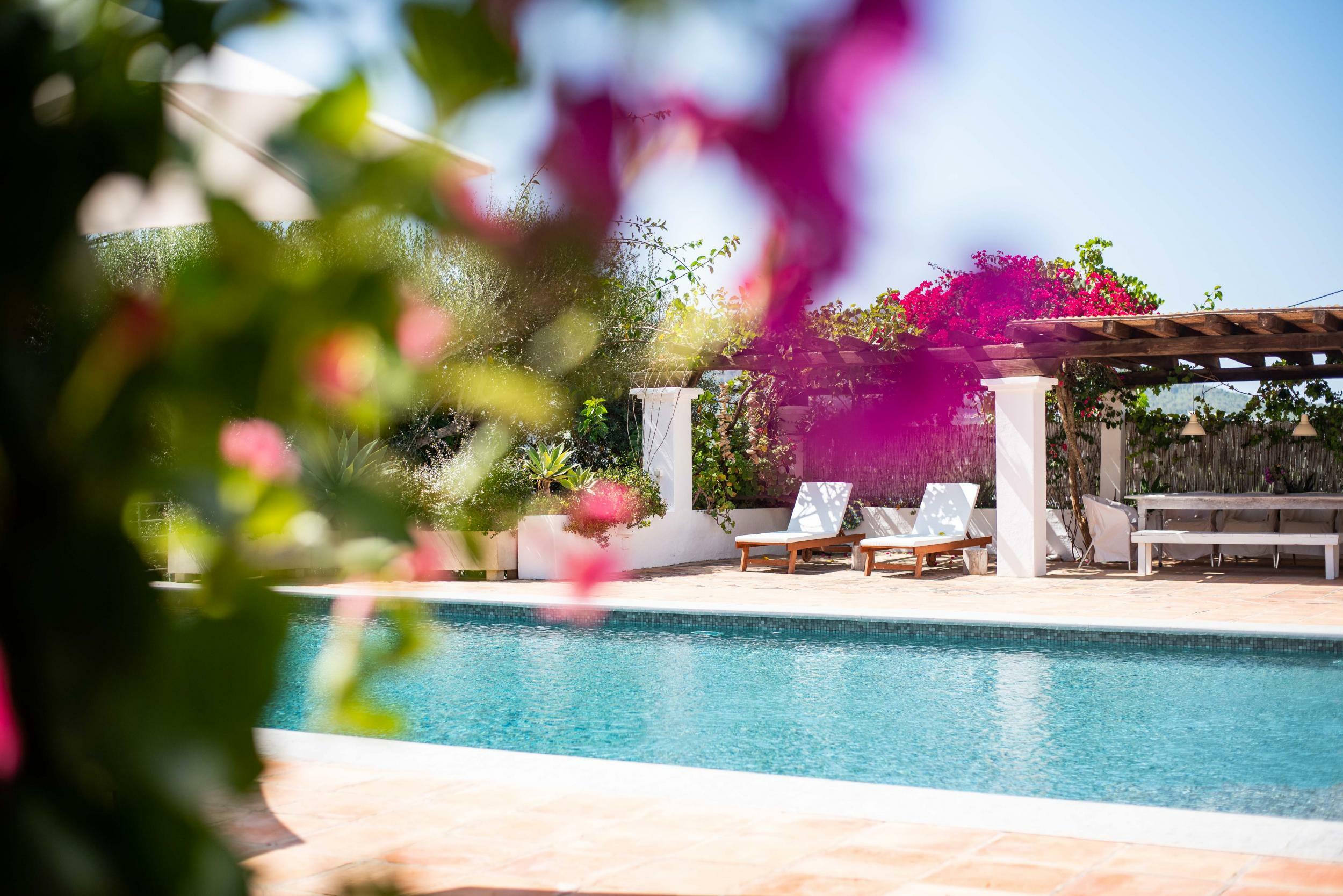 The villa’s terraces are designed for easy, all-day outdoor living. The rectangular pool, lined with turquoise tiles, is framed by sunbeds, umbrellas and lush planting for privacy.