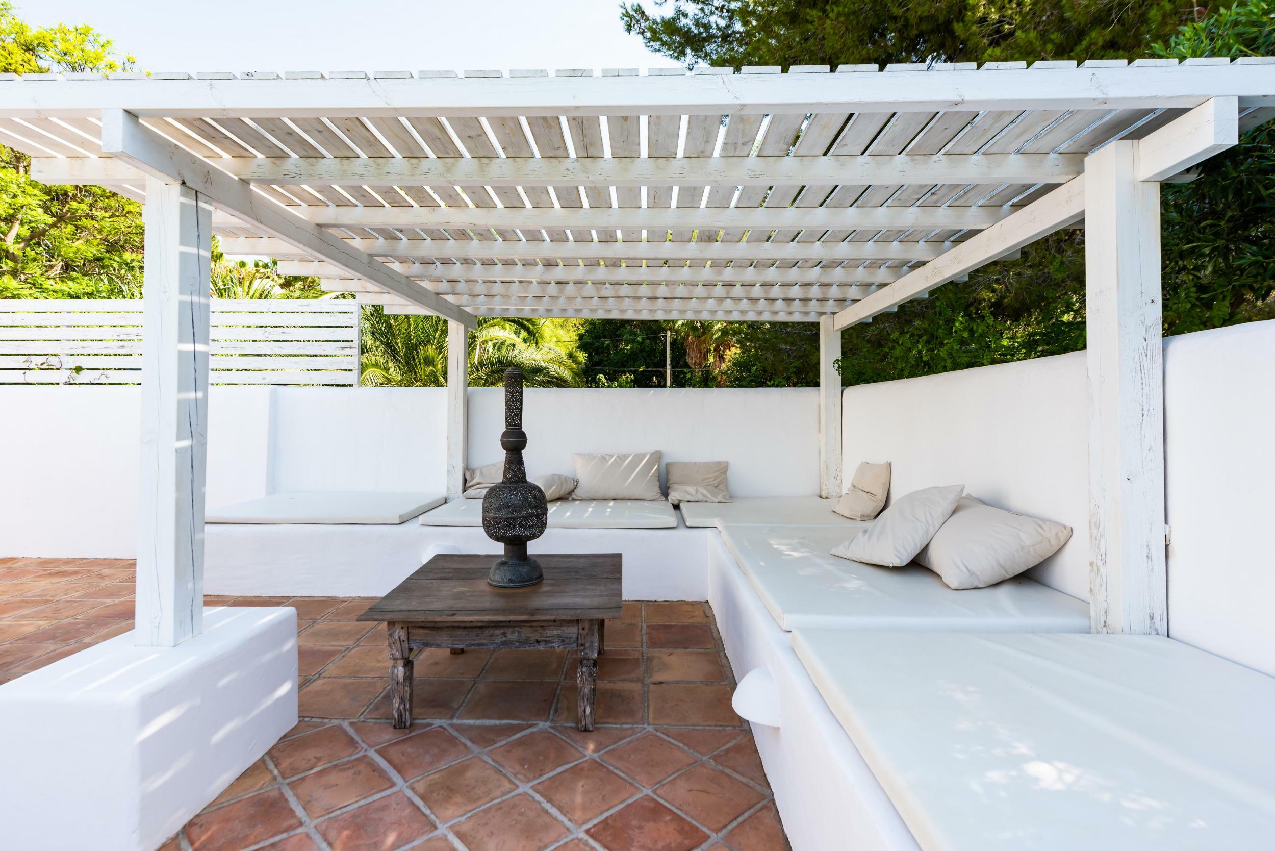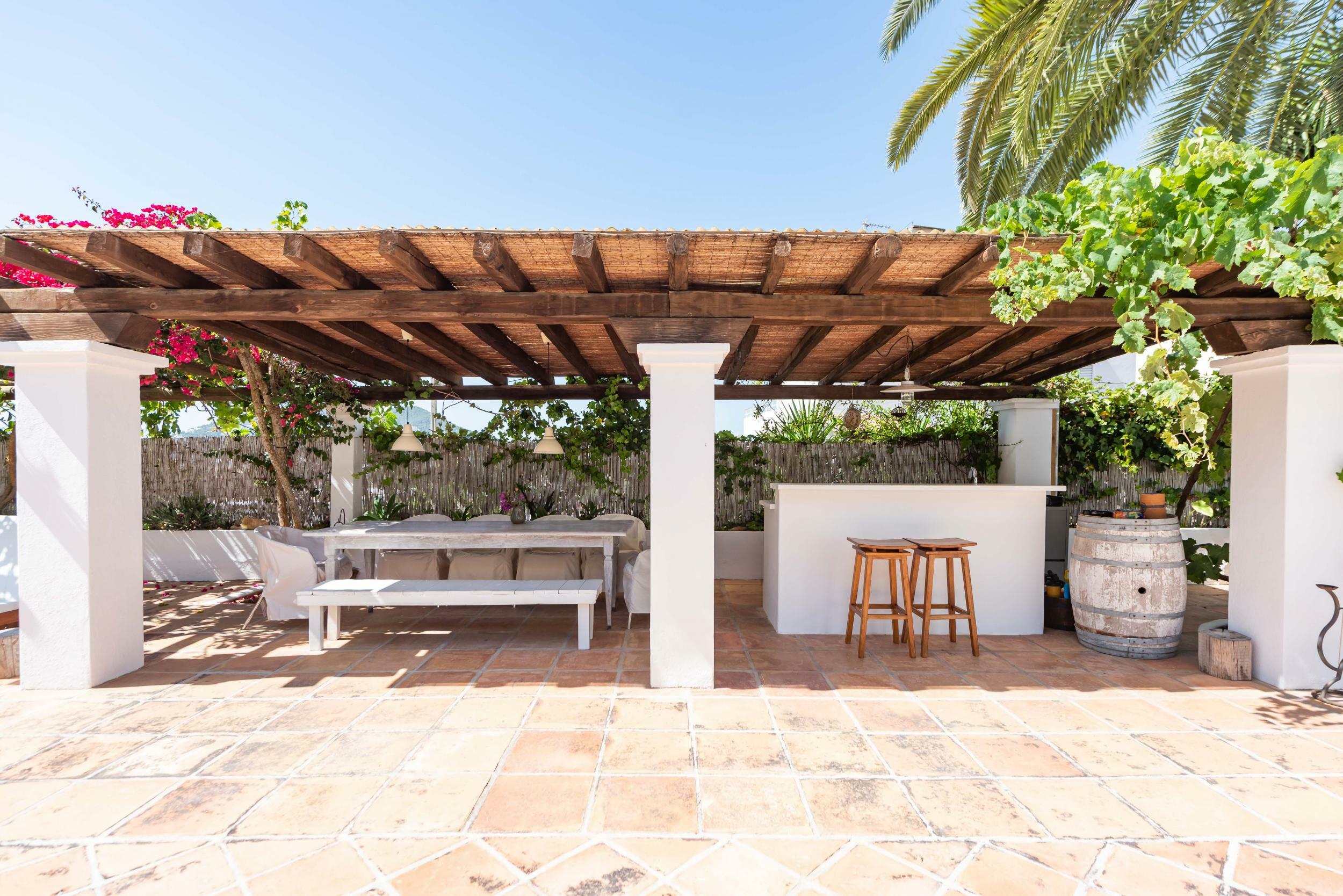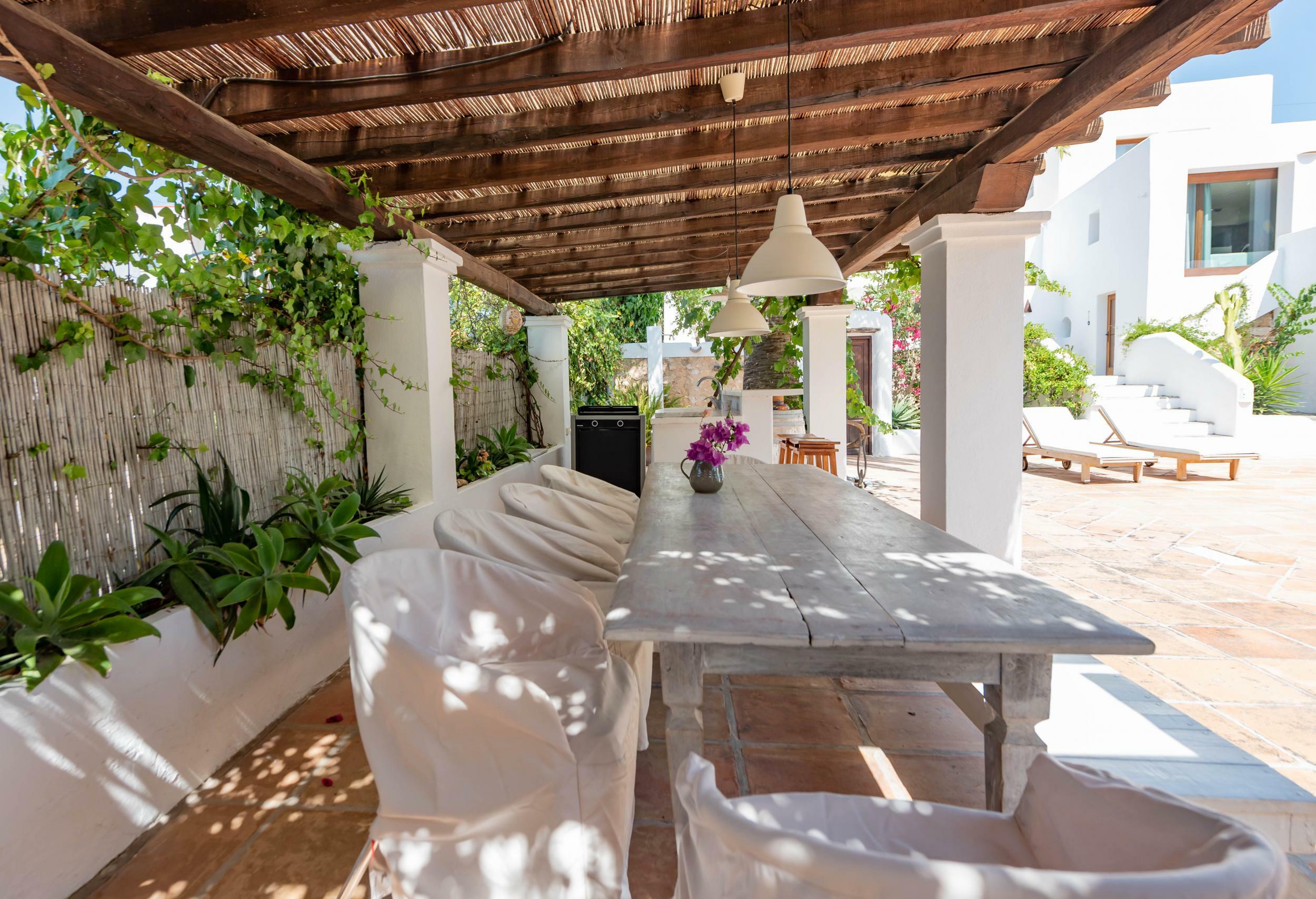 A shaded pergola shelters the outdoor dining table, perfect for long lunches or dinners with the sound of the sea in the background.