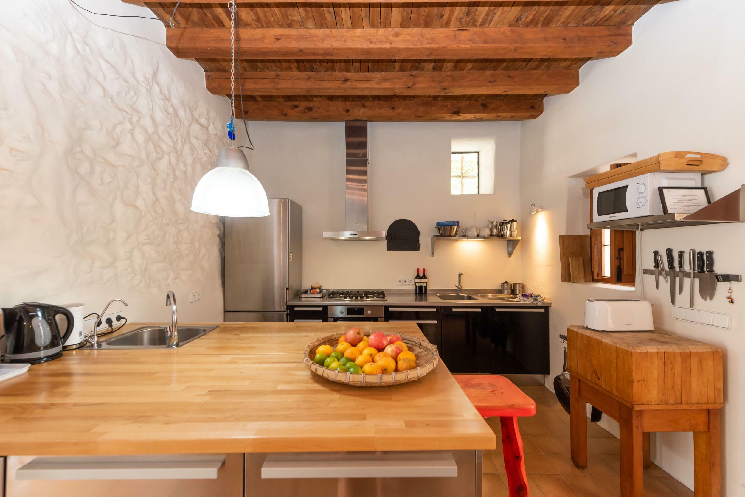 The sleek kitchen is fully equipped and finished in warm wood and clean lines, while rattan and linen details bring warmth and island authenticity.