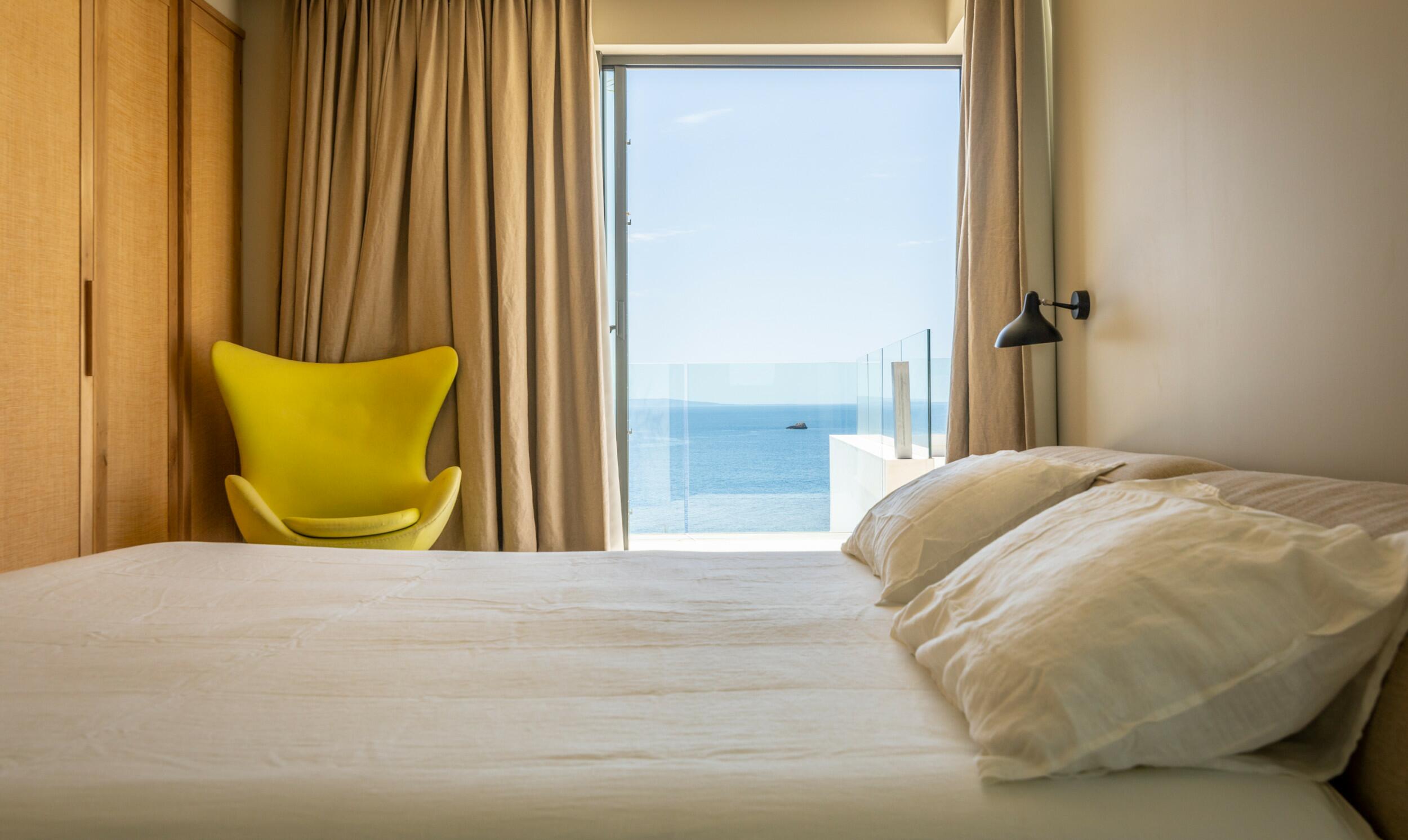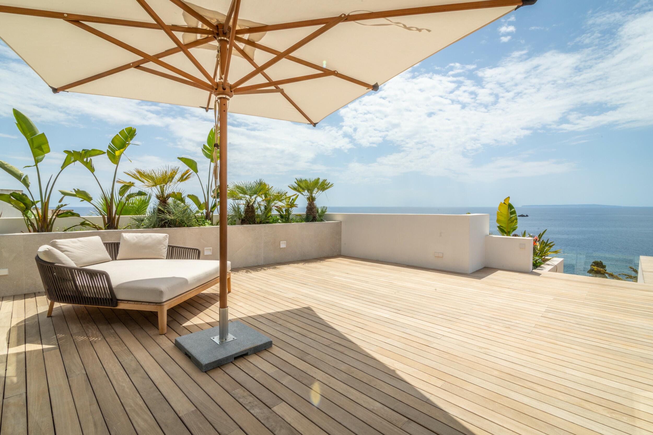 Exclusive rooftop position with full privacy and stunning sea views extending to Formentera. Features a large private terrace with sunbeds, direct pool access, double bed, bathroom with shower, AC, TV, WiFi and minibar.