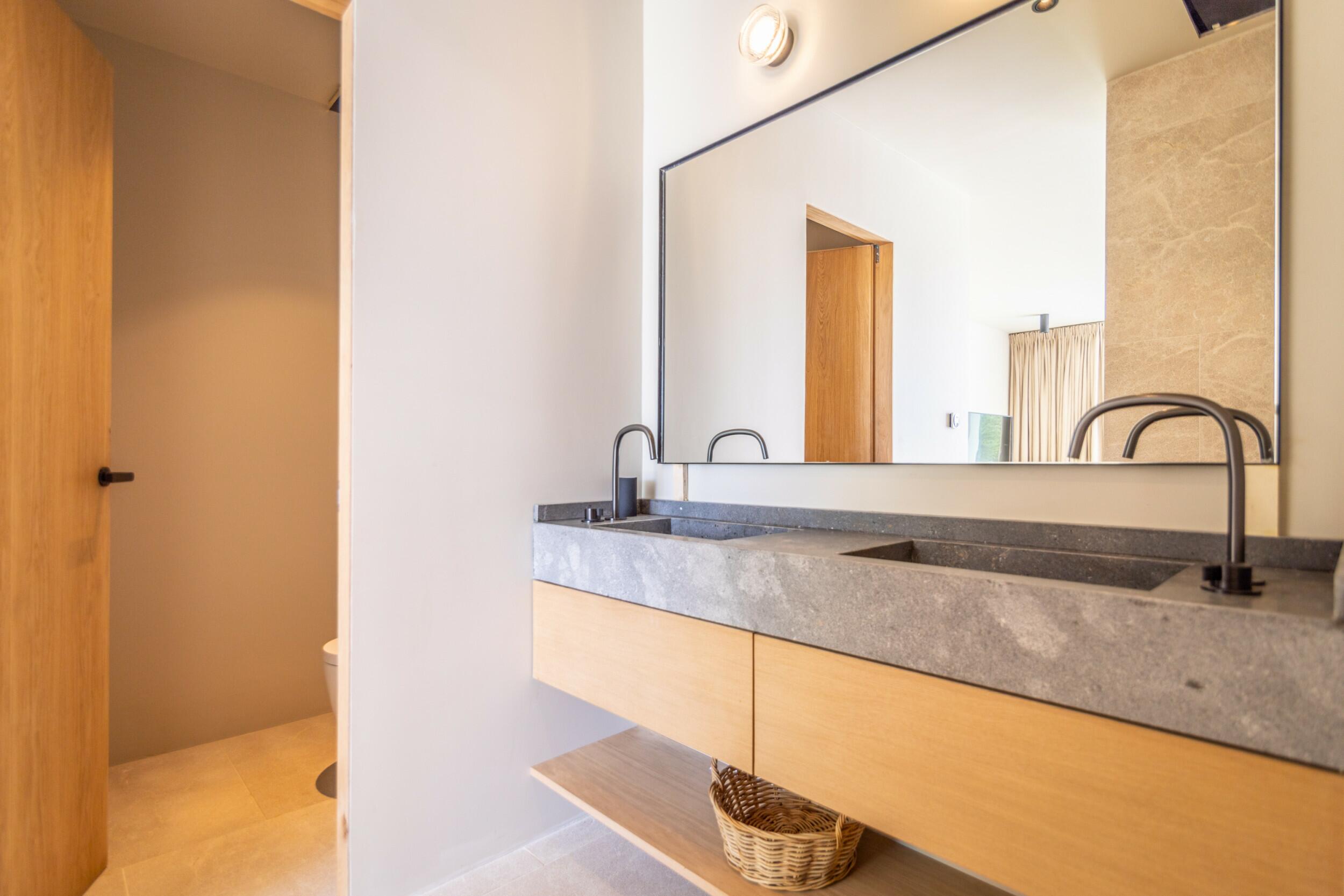Interiors are bright and welcoming, defined by whitewashed walls, sabina wood ceilings and natural textures. The living areas offer a relaxed, comfortable ambiance, with TVs, ambient lighting and lounge spaces ideal for unwinding together. The main house includes an additional fully equipped kitchen and dining area, making the property perfectly suited to hosting larger groups.
